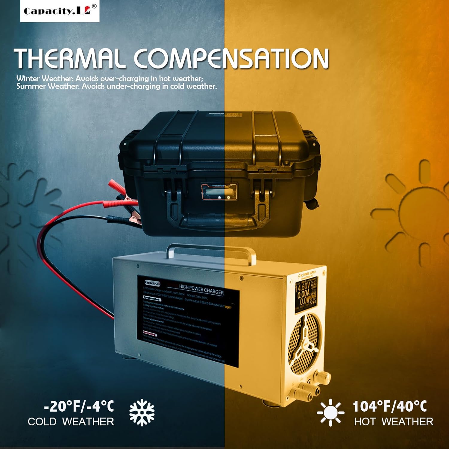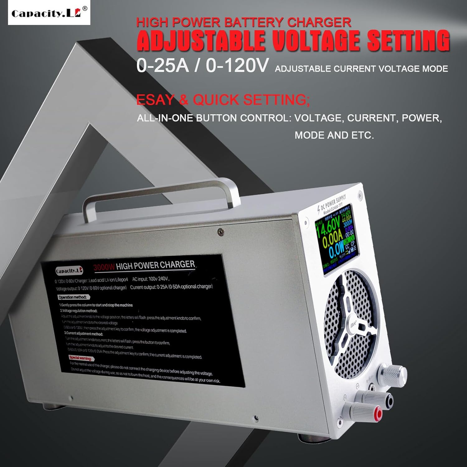 - CARREGADOR DE BATERIA LIFEPO4 DE ALTA POTÊNCIA: Com corrente e tensão ajustáveis de 0-50A / 0-60V, este carregador é ideal para baterias LiFePO4 de grande capacidade. O chip de circuito inteligente melhora a taxa de conversão de carga e estabiliza a tensão de descarga, proporcionando um carregamento superior em comparação com carregadores comuns. O carregador interrompe automaticamente a carga quando a bateria está cheia.