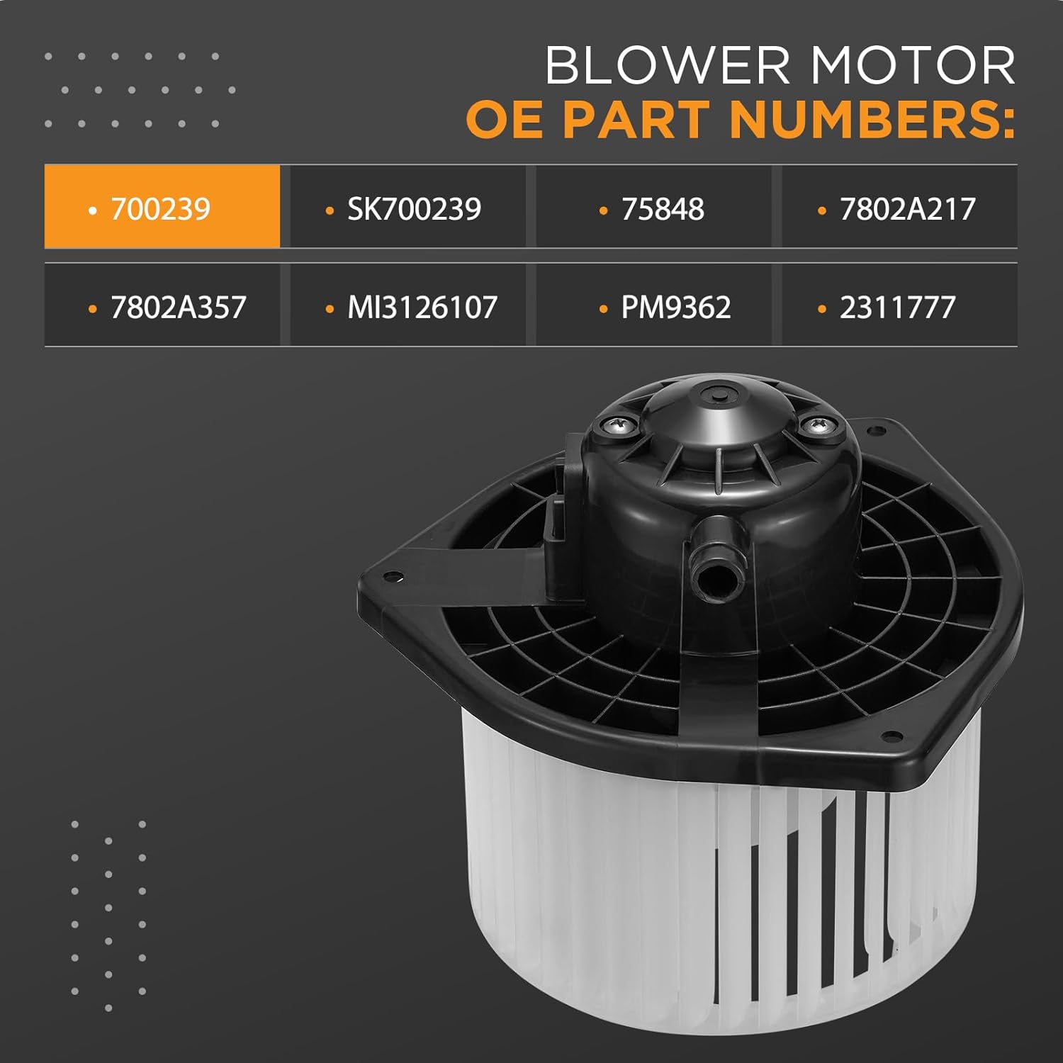 - Números de Peça OE: O número da peça do motor do ventilador A/C é 700239, SK700239, 75848, 7802A217, 7802A357, MI3126107, PM9362, 2311777.