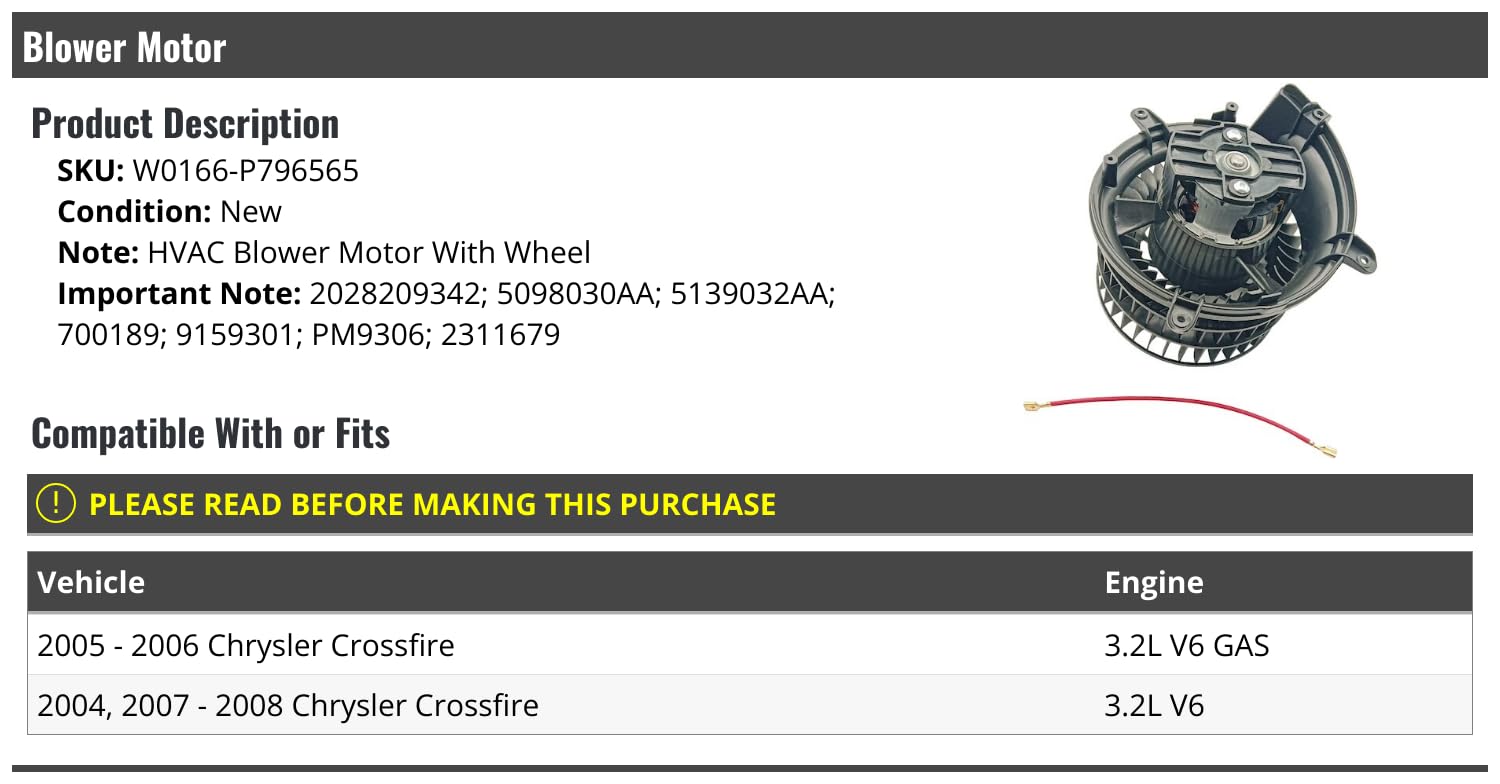Motor de Ventilador HVAC com Roda – Compatível com Chrysler Crossfire 2004-2008 3.2L V6