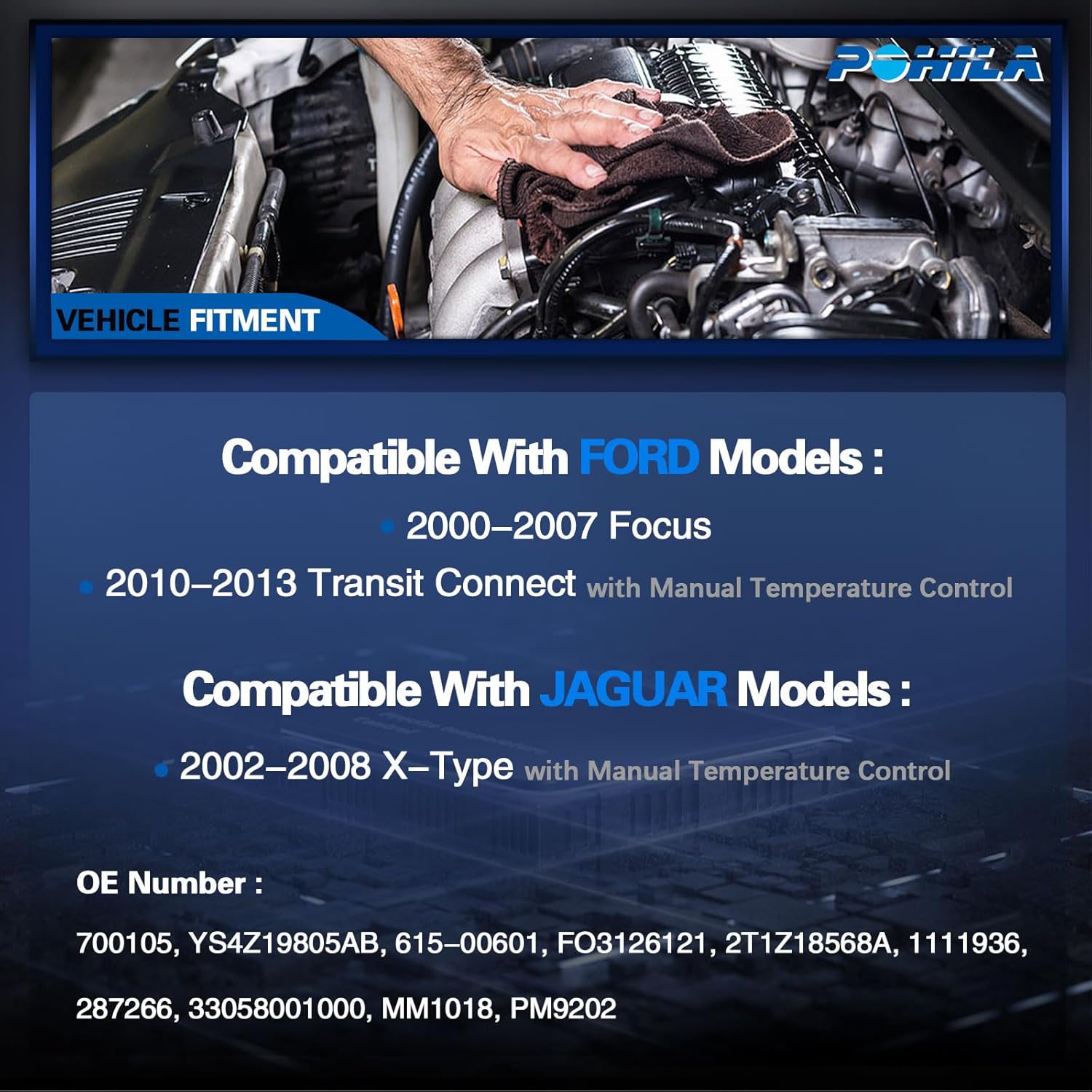 - Compatibilidade: Compatível com Ford Focus de 2000 a 2007 e Ford Transit Connect de 2010 a 2013 com controle de temperatura manual. A instalação é simples, bastando remover alguns parafusos. Ao substituir o motor do ventilador, é recomendável também trocar o relé/resistor do motor do ventilador por um novo.