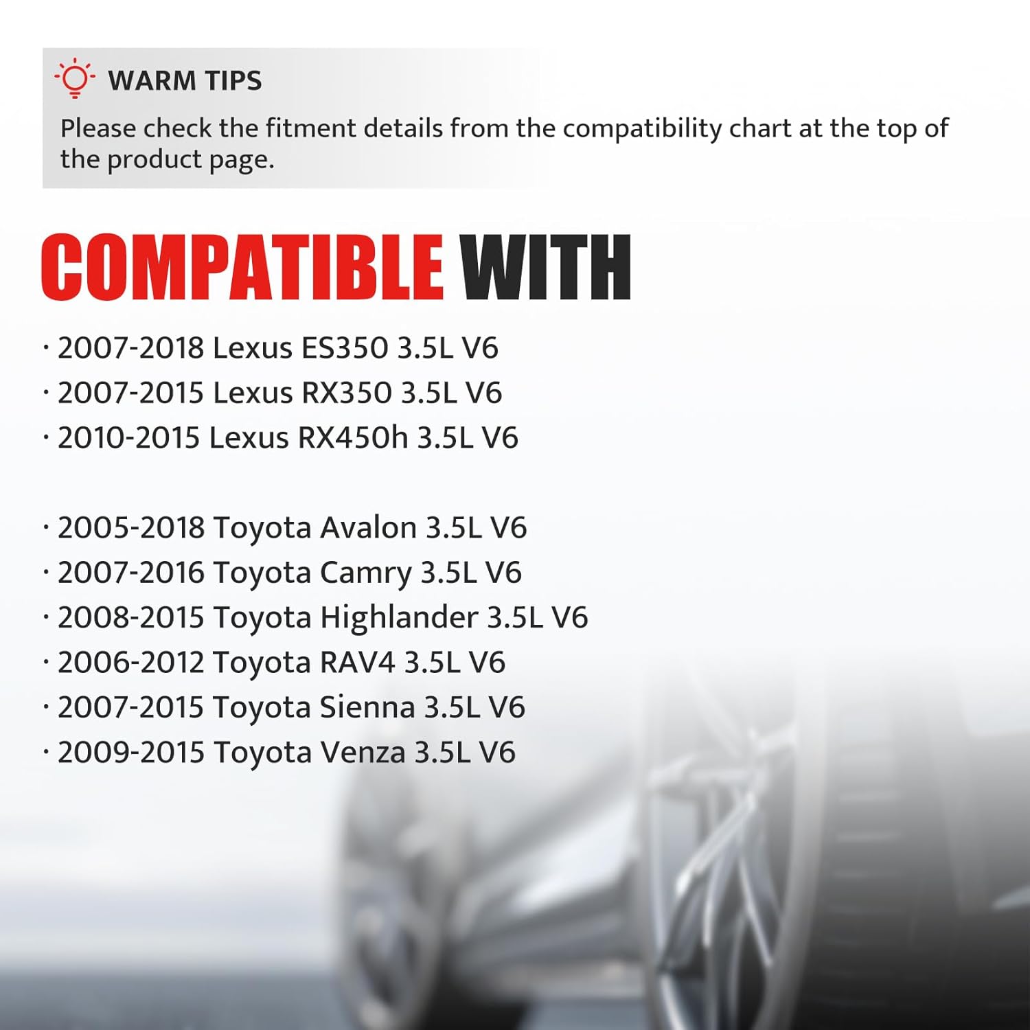 – Compatibilidade: Projetado para uma ampla gama de veículos Toyota e Lexus com motor V6 de 3,5L.