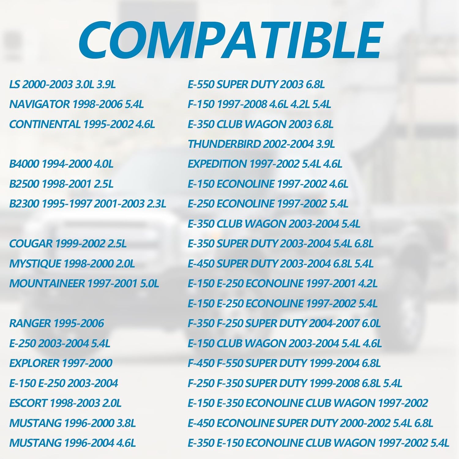 • Adequação: Compatível com uma ampla gama de modelos Ford, incluindo F-150/250/350/450 de 1997 a 2008, Mustang de 1996 a 2004, Ranger de 1995 a 2006, E-150/250/350/450/550 de 1997 a 2004, e Econoline Super Duty de 1997 a 1999. Também se encaixa em modelos Lincoln de 1998 a 2006, como Navigator e Continental, além de Mercury Mountaineer e Cougar.