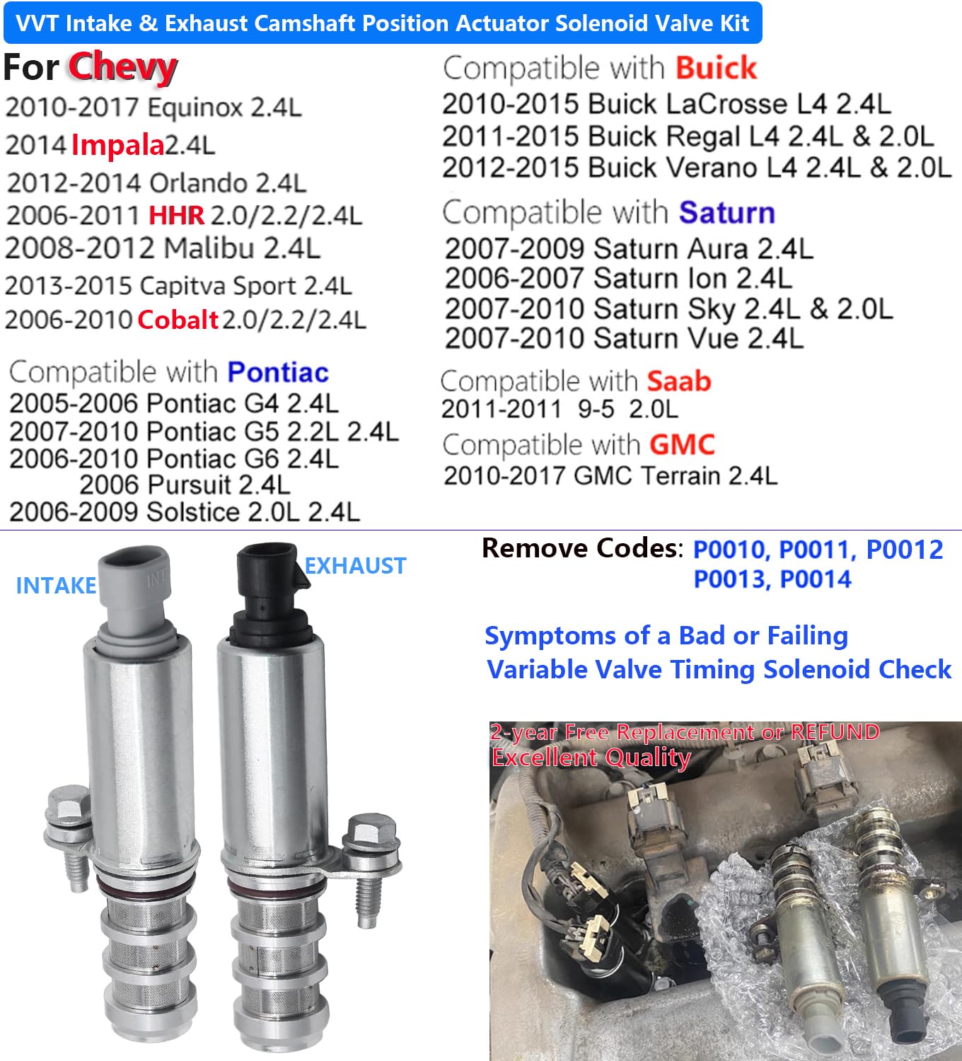 O Intake é compatível com os números de peça 12655420, 12628347, 12646783, 12578517, 12679099, 917215, 917-215, 2T1014 para o solenoide de admissão e 12655421, 12628348, 12646784, 12578518, 12679100, 917216, 917-216, 2T1015 para o solenoide de escape. O kit inclui uma válvula solenoide de admissão, uma válvula solenoide de escape, um sensor de árvore de cames e um sensor de virabrequim, permitindo a reparação de códigos de erro do motor (P0010, P0011, P0013 e P0014) e a restauração do desempenho perdido.