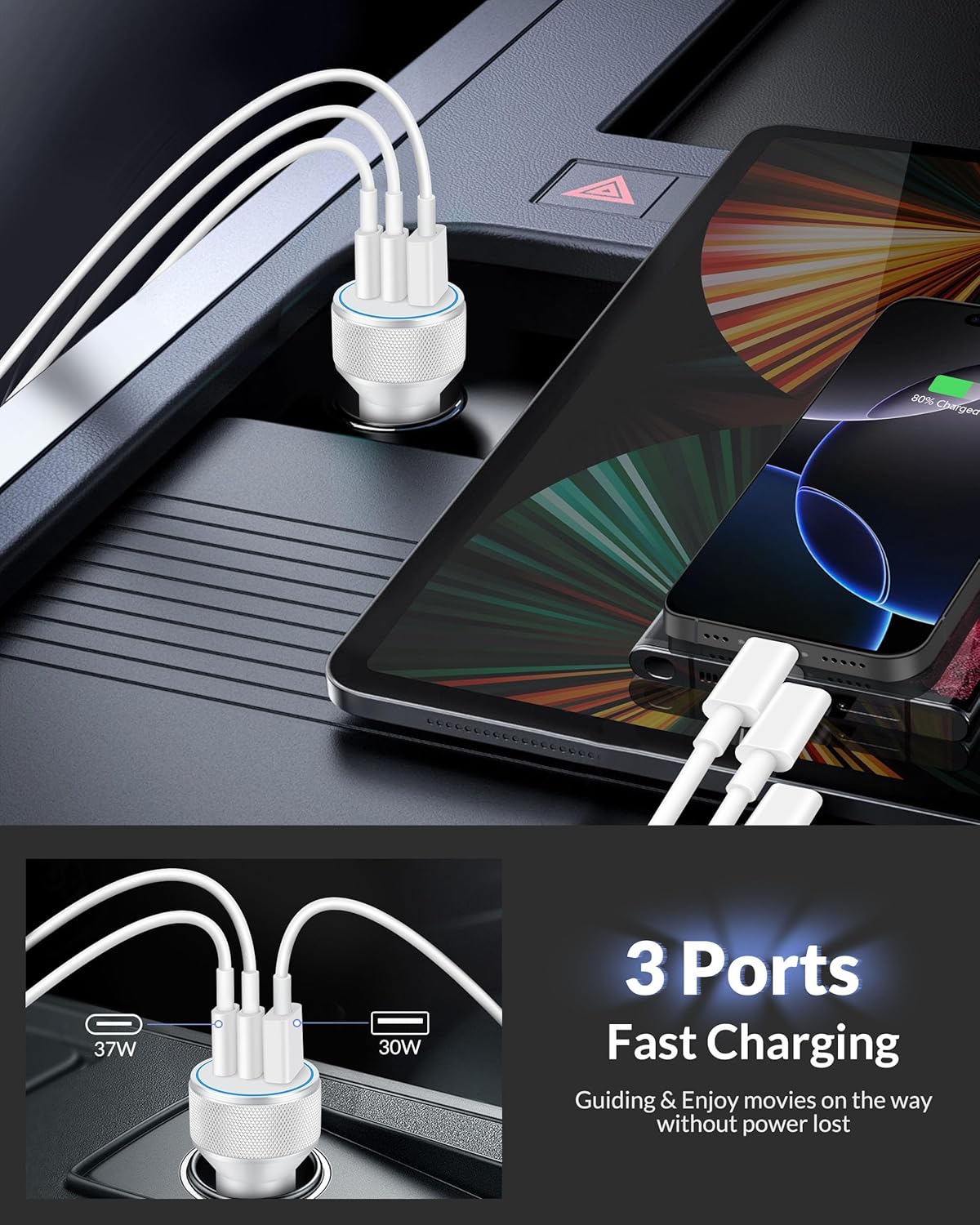 – O que Você Recebe: 2 adaptadores de carregador veicular 67W com 3 portas, 2 cabos USB-C de 3 pés e 1 ano de substituição, além de atendimento ao cliente disponível 24/7.