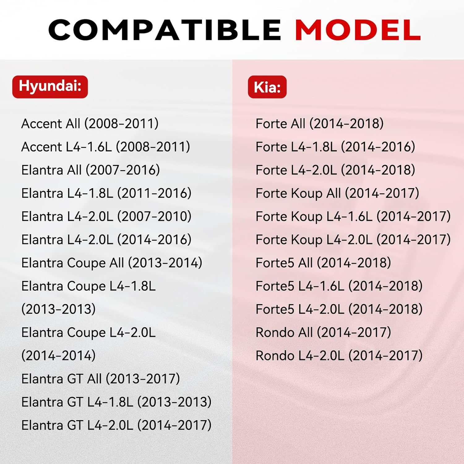 – Dispositivos Compatíveis: Hyundai Accent (2008-2011), Elantra (2007-2016), Elantra Coupe (2013-2014), Elantra GT (2013-2017); Kia Forte (2014-2018), Forte Koup (2014-2017), Forte5 (2014-2018), Rondo (2014-2017).