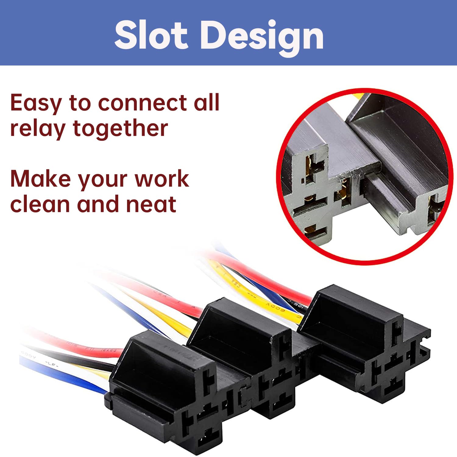 A soquete de relé interligável é um dos grandes destaques deste conjunto. Com um sistema de slots macho-fêmea, a instalação se torna mais organizada e intuitiva, reduzindo o risco de erros de conexão. Os cinco fios de cores distintas não apenas facilitam a identificação durante a instalação, mas também garantem que cada conexão seja feita de forma clara e precisa, essencial em projetos mais complexos.