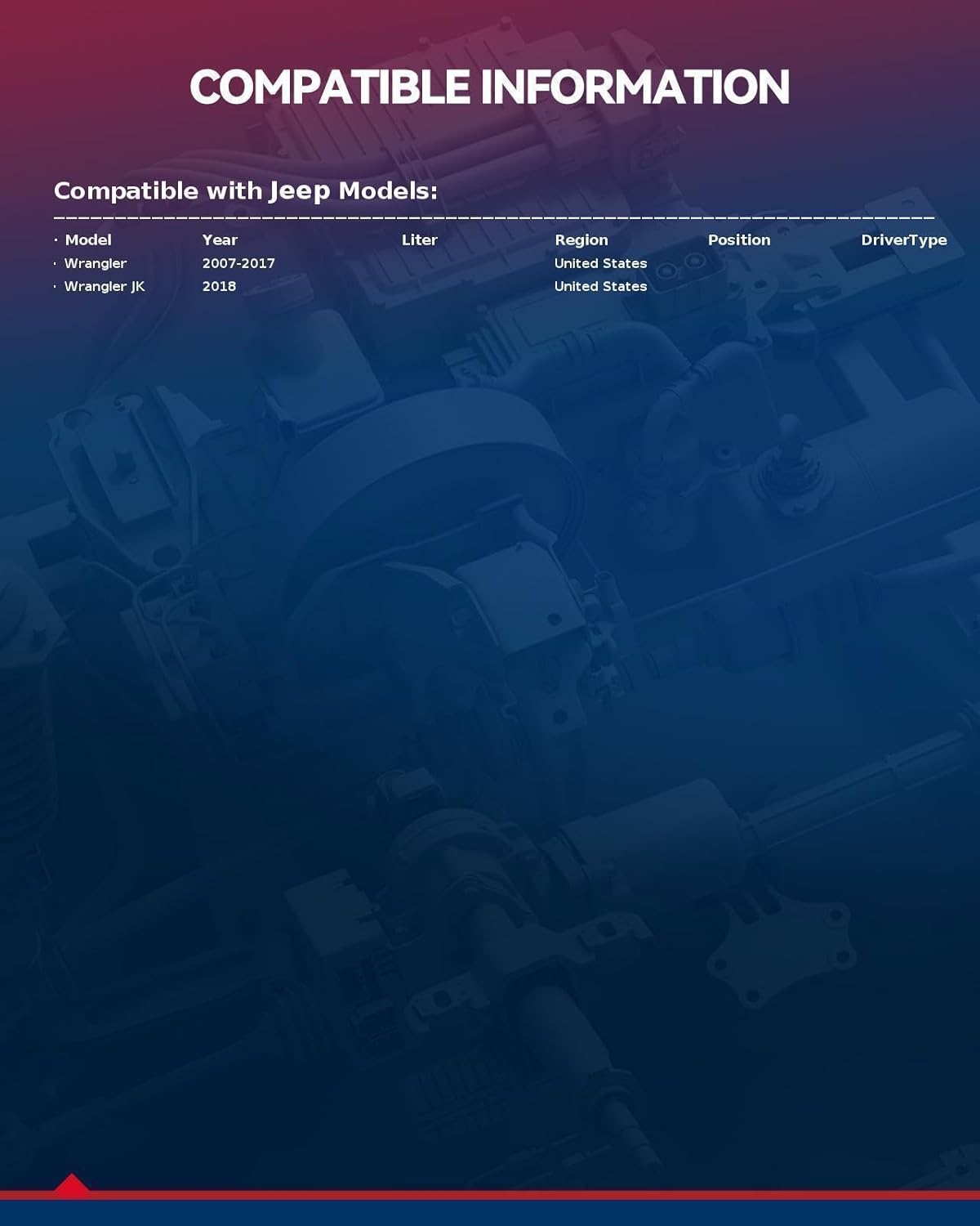– Compatibilidade: Projetado especificamente para Wrangler de 2007 a 2017 e Wrangler JK de 2018.
