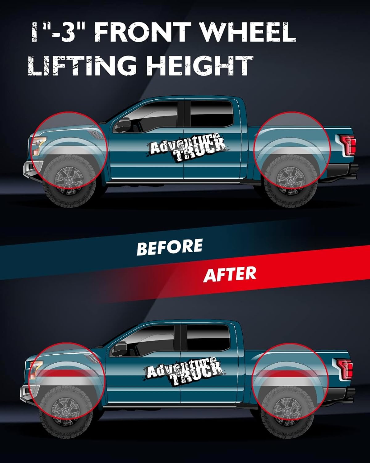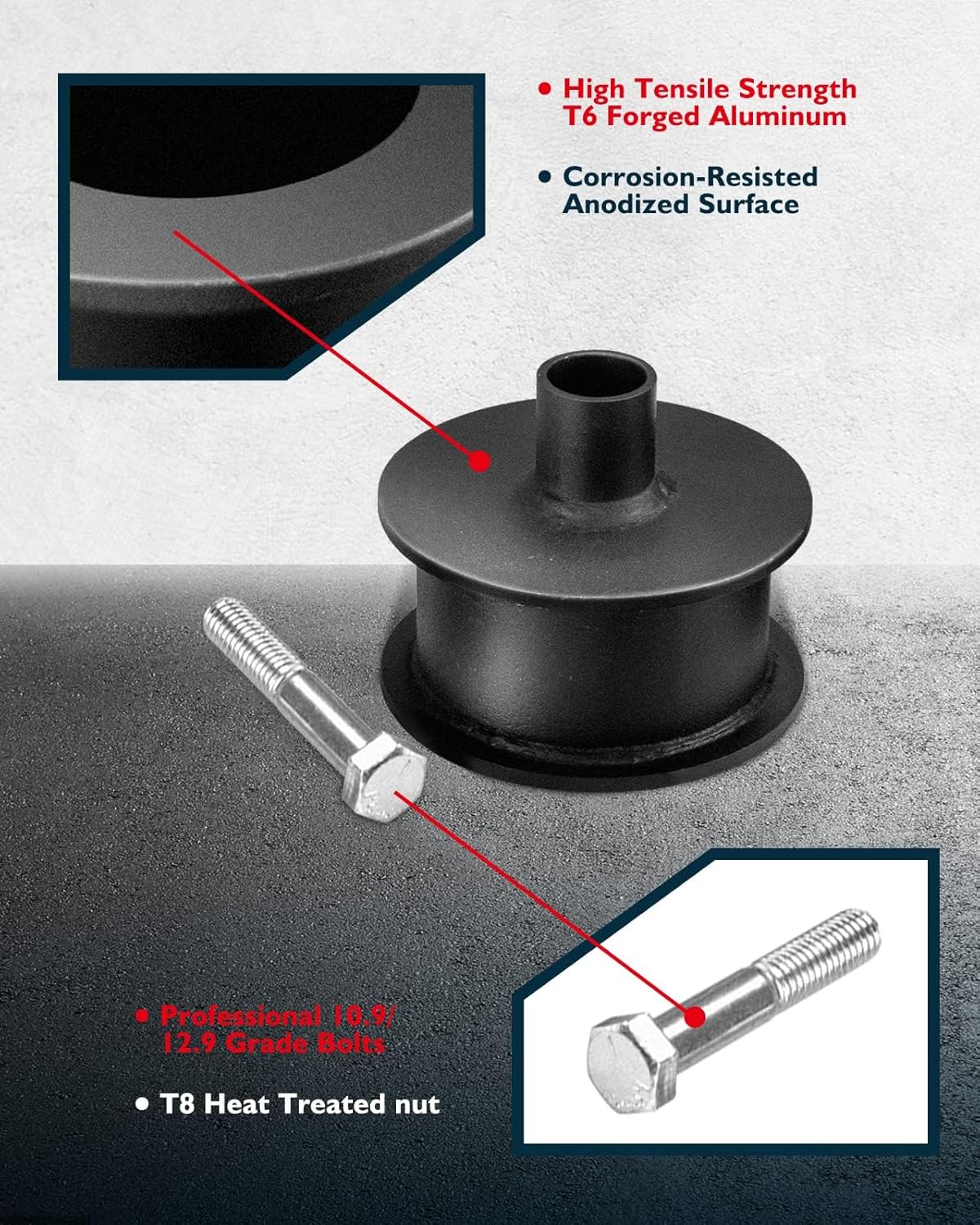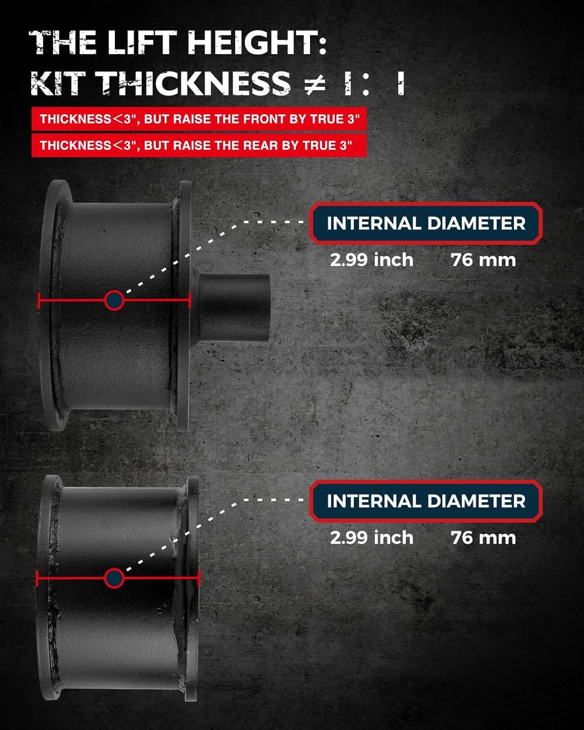 – Altura de Elevação: É importante notar que a relação entre a altura de elevação e a espessura do kit não é de 1:1 devido à geometria da suspensão. A espessura dos kits de elevação dianteira e traseira é inferior a 3” e 3”, mas os kits de nivelamento realmente elevarão o veículo em 3” e 3”.