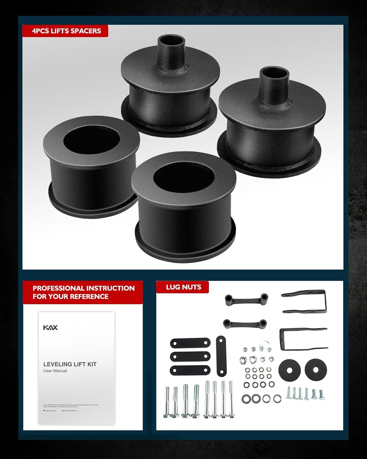 Para instalar o KAX 3″ Front and 3″ Rear Leveling Lift Kits, comece levantando o veículo em um local seguro e nivelado. Remova as rodas dianteiras e traseiras para facilitar o acesso aos componentes da suspensão. Siga as instruções do manual para instalar os espaçadores de suspensão e os extensores de choque, garantindo que todas as peças estejam bem fixadas. Após a instalação, verifique o alinhamento da suspensão e ajuste conforme necessário para garantir uma condução suave e segura.