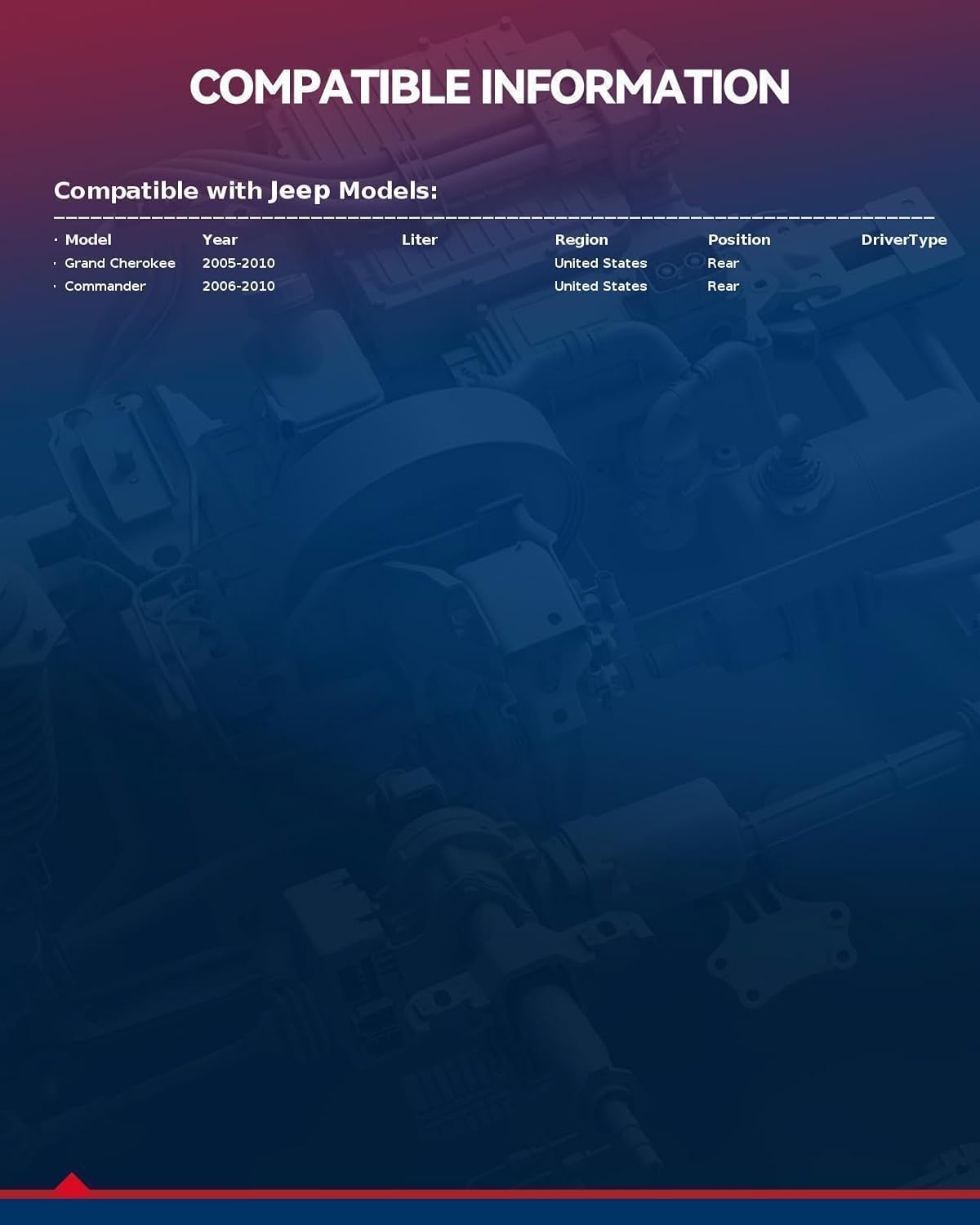 Este conjunto de rolamentos de roda é perfeitamente compatível com os modelos Jeep Grand Cherokee (2005-2010) e Jeep Commander (2006-2010), garantindo um encaixe preciso e funcionalidade ideal para o seu veículo.