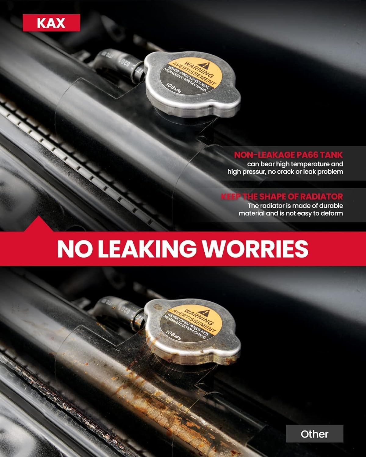 [Durabilidade e Impermeabilidade] O radiador é fabricado com um tanque de água de plástico de alta qualidade e um núcleo de alumínio, que não apenas previne a corrosão, mas também oferece uma excelente condutividade térmica. Todos os radiadores automotivos KAX passam por rigorosos testes de impermeabilidade, garantindo uma vida útil prolongada e um desempenho confiável.