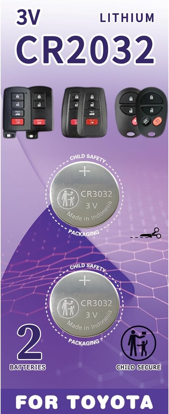 Bateria de substituição para chaveiro (Pack de 2) CR2032, compatível com modelos Toyota RAV4, Camry, Corolla, Highlander, Prius, Sienna, Tacoma, Tundra, 4Runner, Avalon, CHR, Sequoia, Supra e GR86. Oferece alta durabilidade e desempenho confiável, garantindo que seu controle remoto funcione perfeitamente. Fácil de instalar, é a solução ideal para manter a segurança e a conveniência do seu veículo.