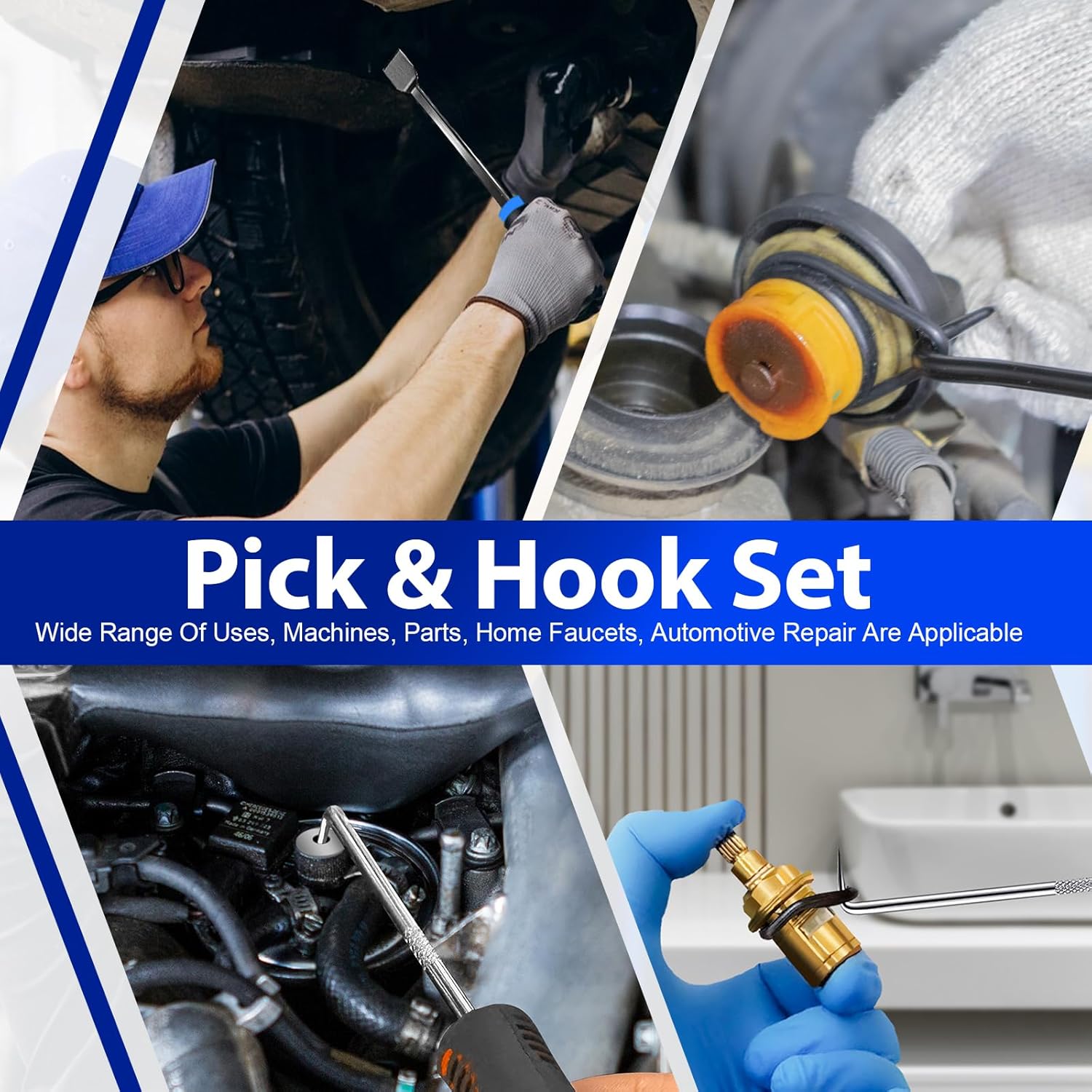 O conjunto inclui uma variedade de ganchos e picadores, como um picador mecânico longo de 180 graus, ganchos curvos de 135 graus, ganchos de 45 graus e ganchos de ângulo reto de 90 graus. Além disso, conta com 4 picadores grandes e 4 mini ganchos, perfeitos para tarefas que vão desde a reparação de mangueiras de radiador até a remoção de pequenos fusíveis e gaxetas.