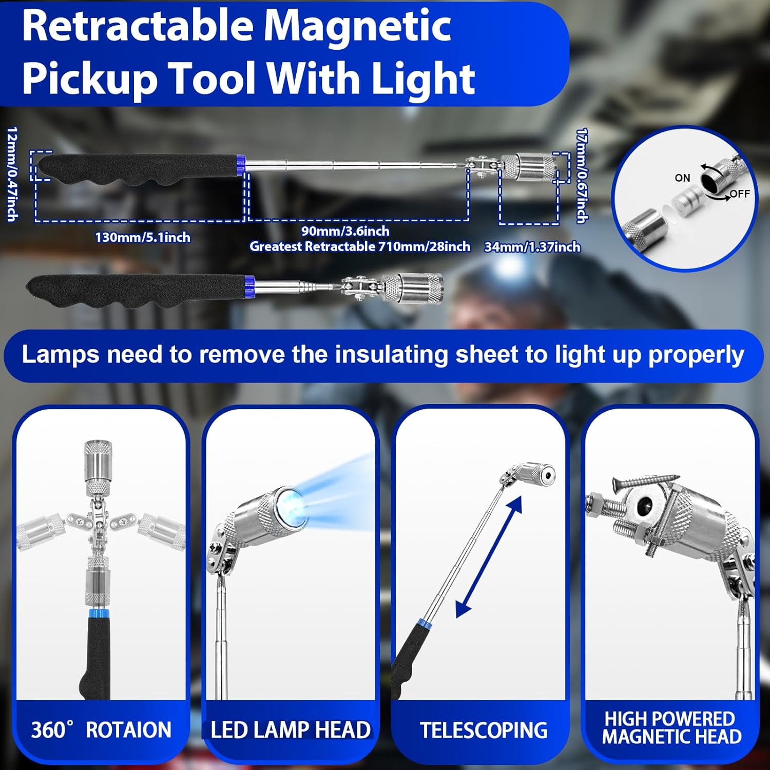 A ferramenta de captação magnética telescópica é um destaque do conjunto, com uma luz LED que ilumina áreas escuras e uma cabeça magnética que se flexiona em 360 graus. Essa ferramenta é ideal para encontrar e pegar peças metálicas em locais apertados, como atrás de eletrodomésticos ou dentro do carro.
