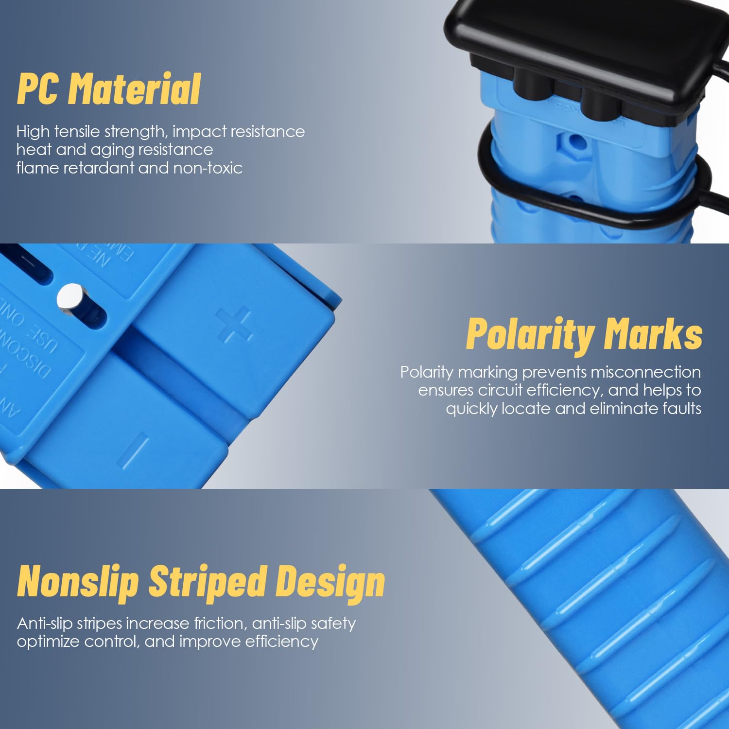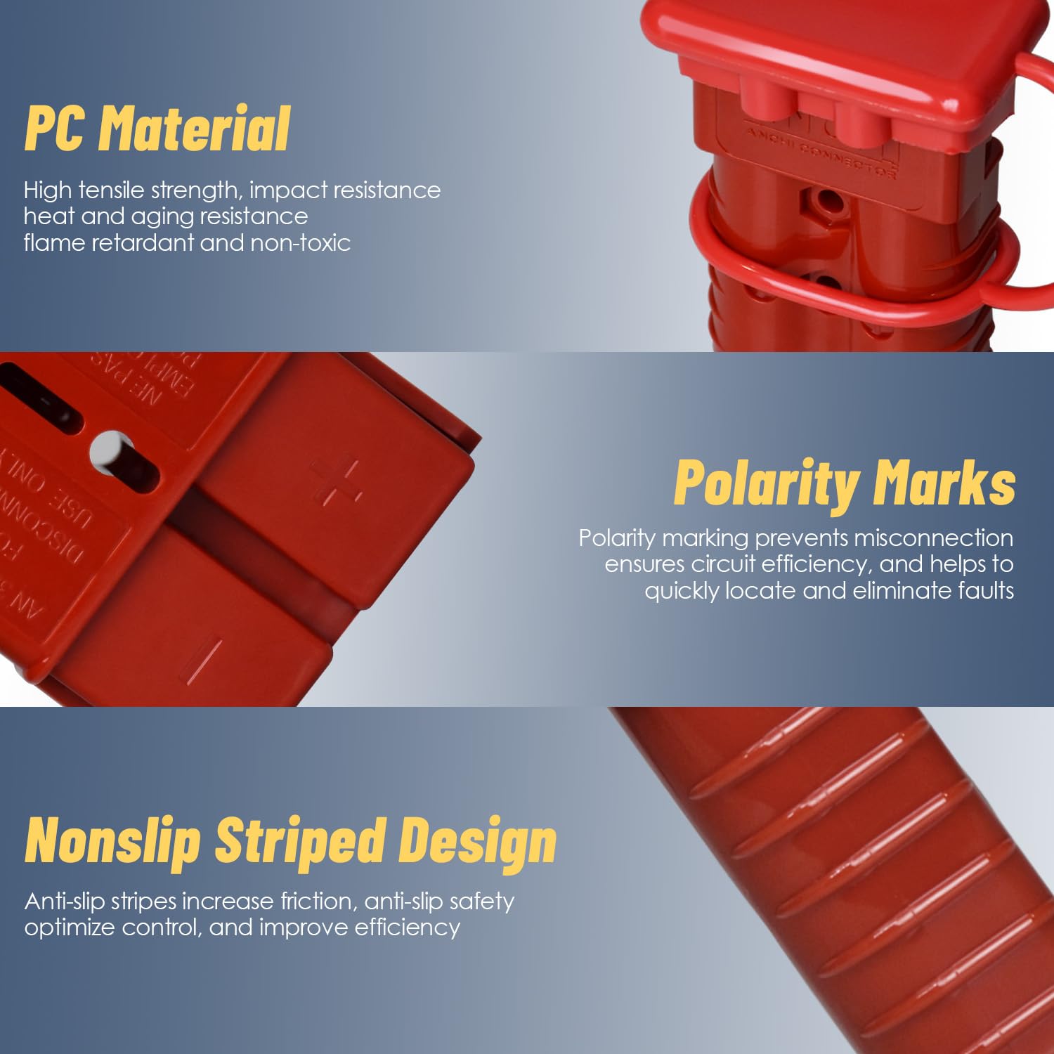 – Aplicações: Conector de bateria, conector de salto para baterias, cabos de salto, carros de corrida, barcos, caminhões, empilhadeiras, entre outros.