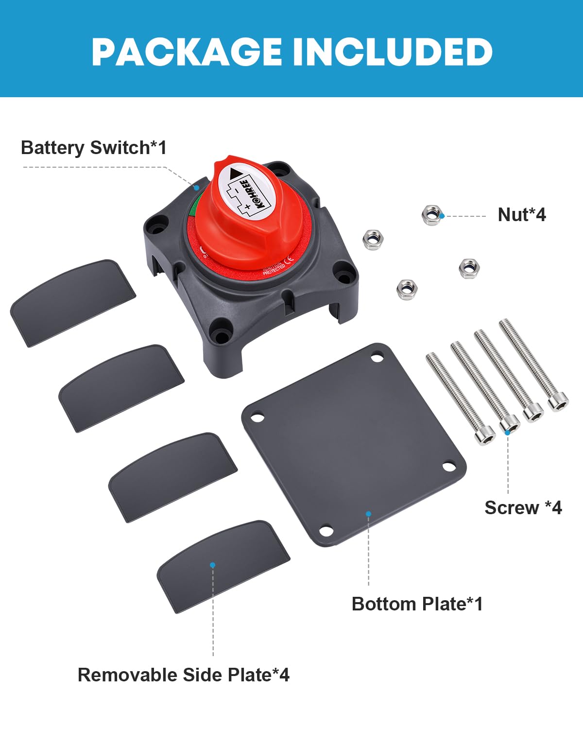 Segurança e Proteção: O Kohree Battery Isolator Switch possui certificação CE e vem com quatro placas laterais removíveis. A tampa traseira isola os terminais contra curtos-circuitos, proporcionando uma camada extra de segurança para o usuário.