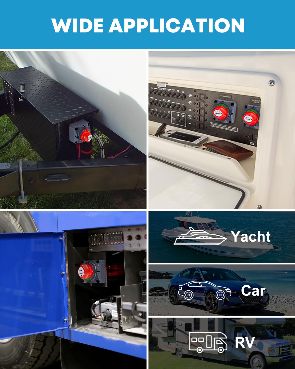 Aplicação Ampla: Este interruptor de corte de bateria é ideal para uso em veículos recreativos (RV), ATVs, carros, embarcações marinhas, barcos, campers, trailers de viagem, caminhões e UTVs. Ele atua como um corte de energia quando o veículo ou embarcação não está em uso, prolongando a vida útil da bateria e evitando problemas elétricos.