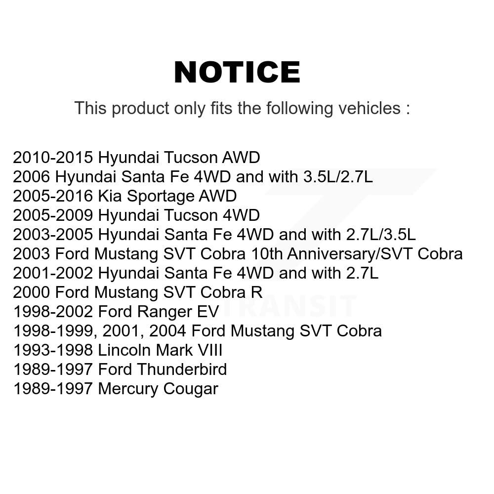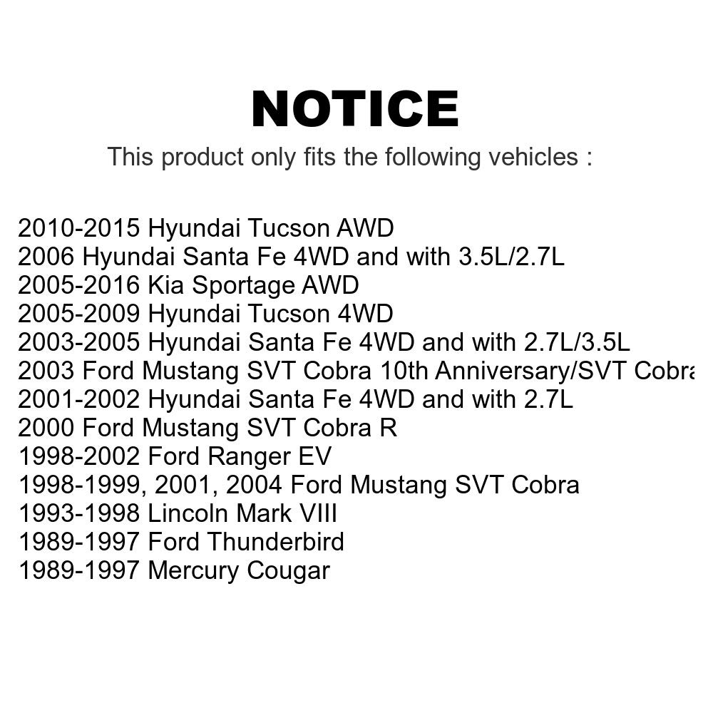- Substituição para: [Traseira] 2010-2015 Hyundai Tucson (AWD), 2005-2016 Kia Sportage (AWD), 2005-2009 Hyundai Tucson (4WD), 2003 Ford Mustang (SVT Cobra 10th Anniversary/SVT Cobra), 2001-2006 Hyundai Santa Fe (4WD), 2000 Ford Mustang (SVT Cobra R), 1998-2002 Ford Ranger (EV), 1998-1999, 2001, 2004 Ford Mustang (SVT Cobra), 1993-1998 Lincoln Mark VIII, 1989-1997 Ford Thunderbird, 1989-1997 Mercury Cougar.