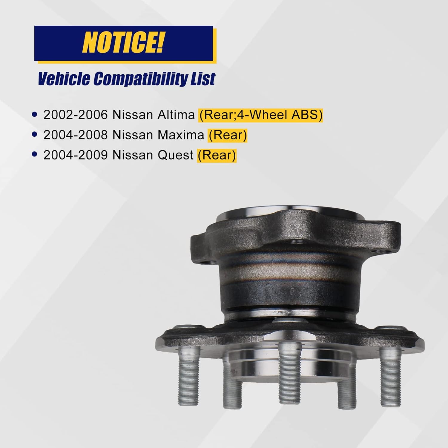 – 512201 Wheel Bearing and Hub Assembly é uma substituição perfeita para o Nissan Altima (Traseiro; 4-Rodas ABS) de 2002 a 2006, Nissan Maxima (Traseiro) de 2004 a 2008 e Nissan Quest (Traseiro) de 2004 a 2009.