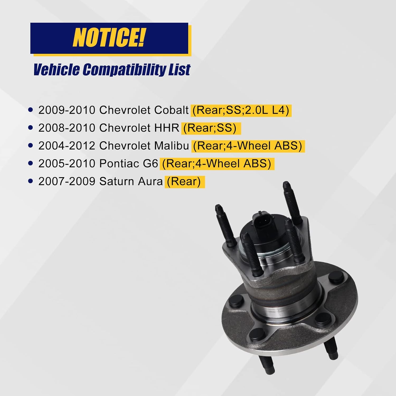 KUSATEC 512285 Conjunto de Rolamento e Cubo de Roda Traseiro para Chevy Cobalt, HHR, Malibu, Pontiac G6 (2005-2010) e Saturn Aura (2007-2009) - 5 Parafusos com ABS