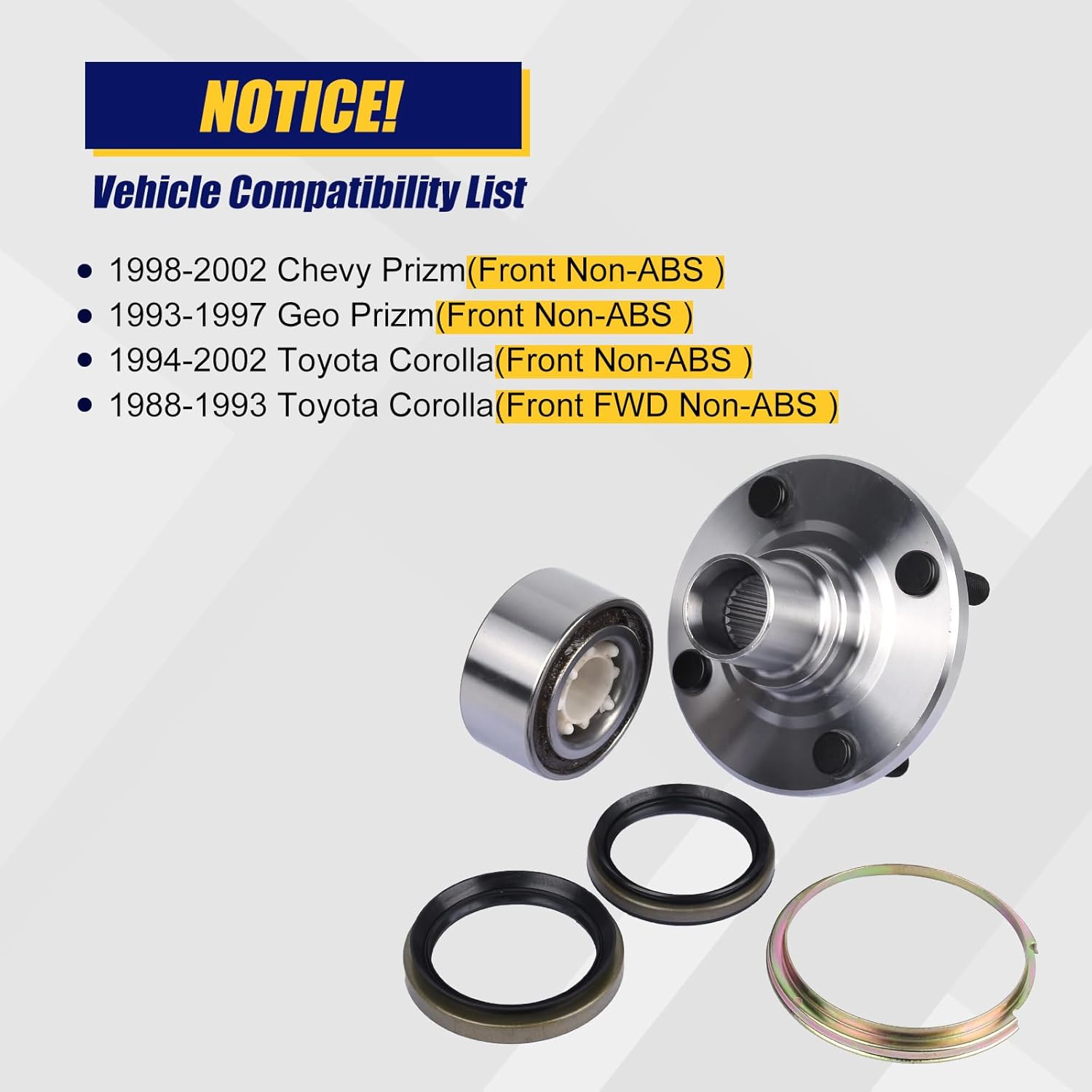- Compatibilidade do Veículo: O conjunto de rolamento e cubo 518507 é compatível com o Chevy Prizm (1998-2002), Geo Prizm (1993-1997) e Toyota Corolla (1994-2002), todos na posição dianteira e sem ABS. Também se aplica ao Toyota Corolla (1988-1993) na versão FWD dianteira.
