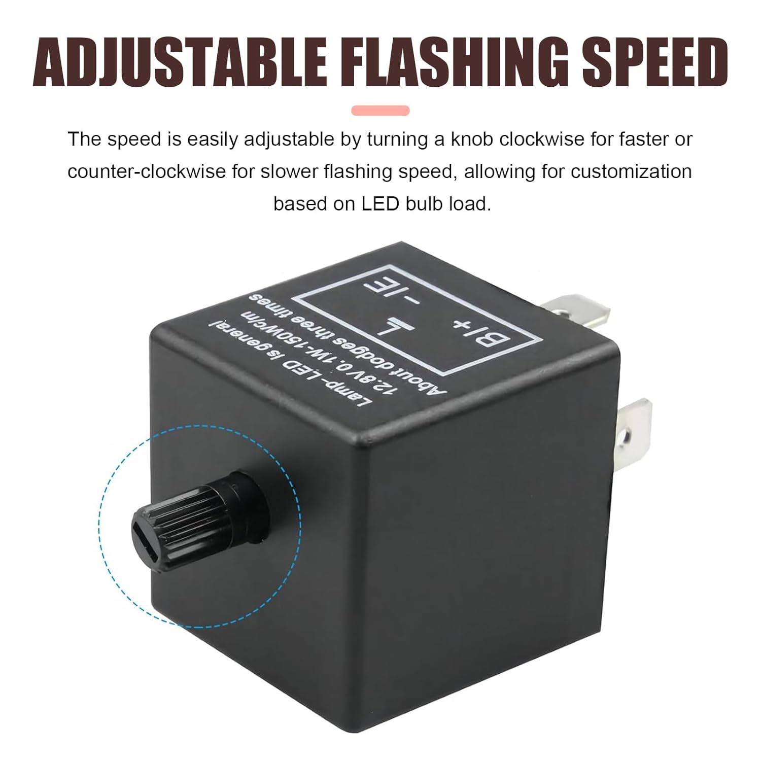 • Ajustável: Com uma função ajustável, o relé permite que você controle a velocidade de piscar. Gire no sentido horário para aumentar a velocidade e no sentido anti-horário para diminuí-la, personalizando a taxa de piscar conforme sua preferência.