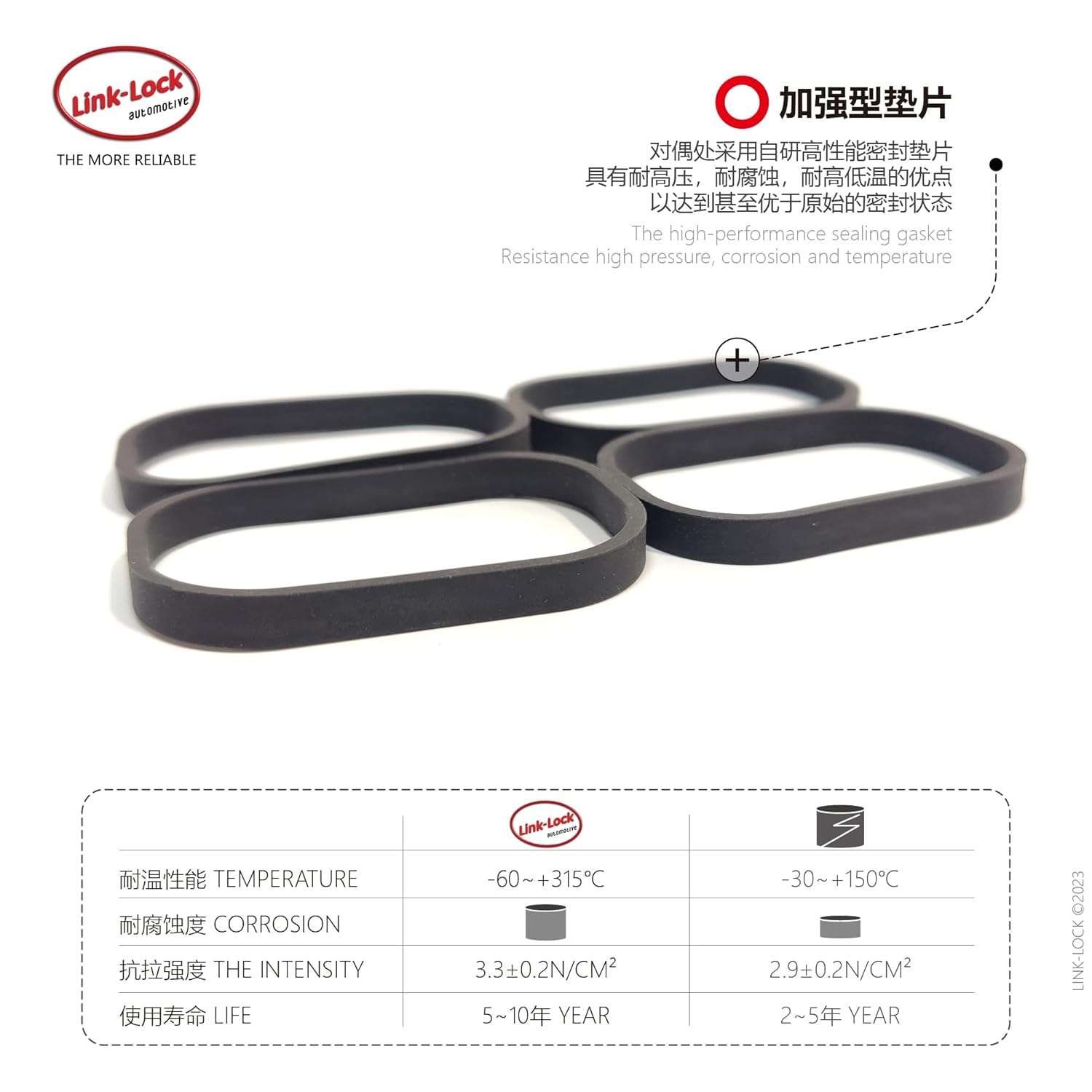 - Selecione uma alternativa de alta qualidade ao LINK-LOCK e volte à estrada. A junta de vedação LINK-LOCK foi otimizada e melhorada, apresentando vantagens como resistência a alta pressão, resistência à corrosão e resistência a altas e baixas temperaturas, alcançando um estado de vedação ainda melhor do que o original. A aparência e a função de cada junta estão perfeitamente alinhadas com os acessórios originais OE, e todas as juntas podem ser entregues para uso após rigoroso desenvolvimento e testes.