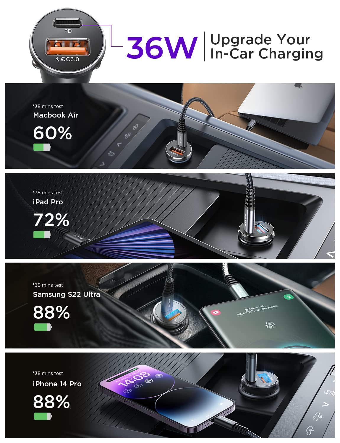- SUPER FAST 36W PD CHARGING: Com a tecnologia de carregamento PD 36W, o adaptador é capaz de carregar a série iPhone 16/15/14/13/12 até 80% e iPads até 60% em apenas 35 minutos. Além disso, ele suporta o carregamento super rápido PPS para os modelos Samsung S23/22/21/20.