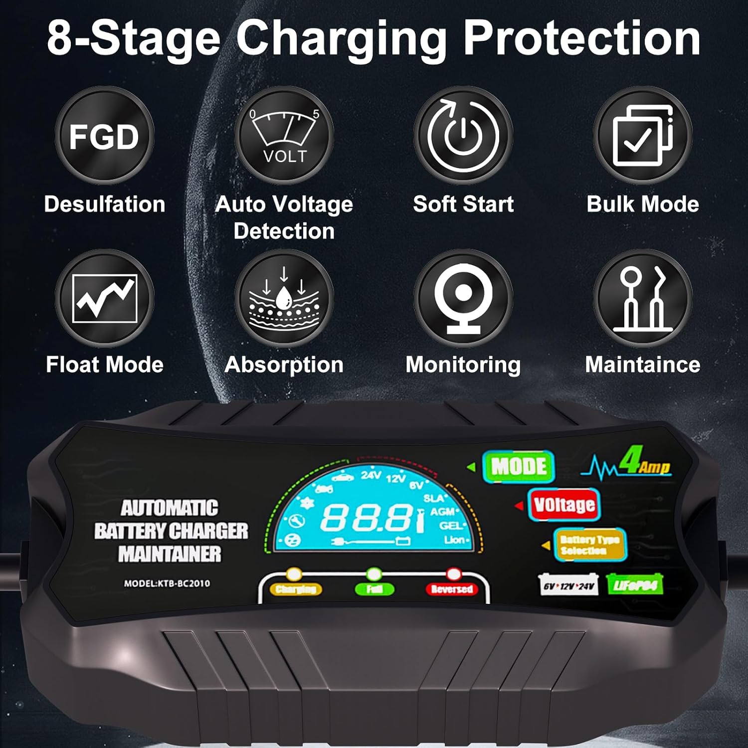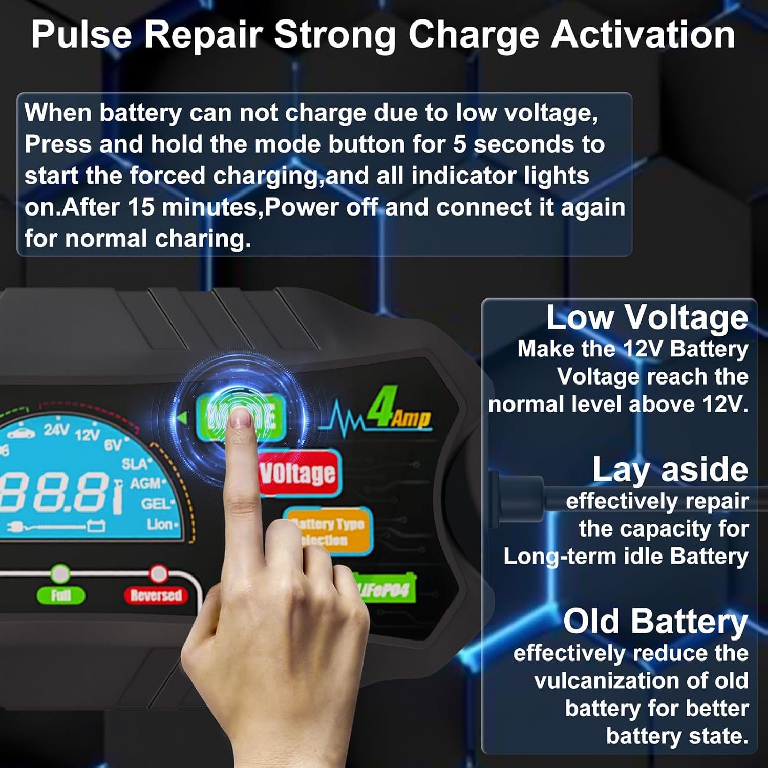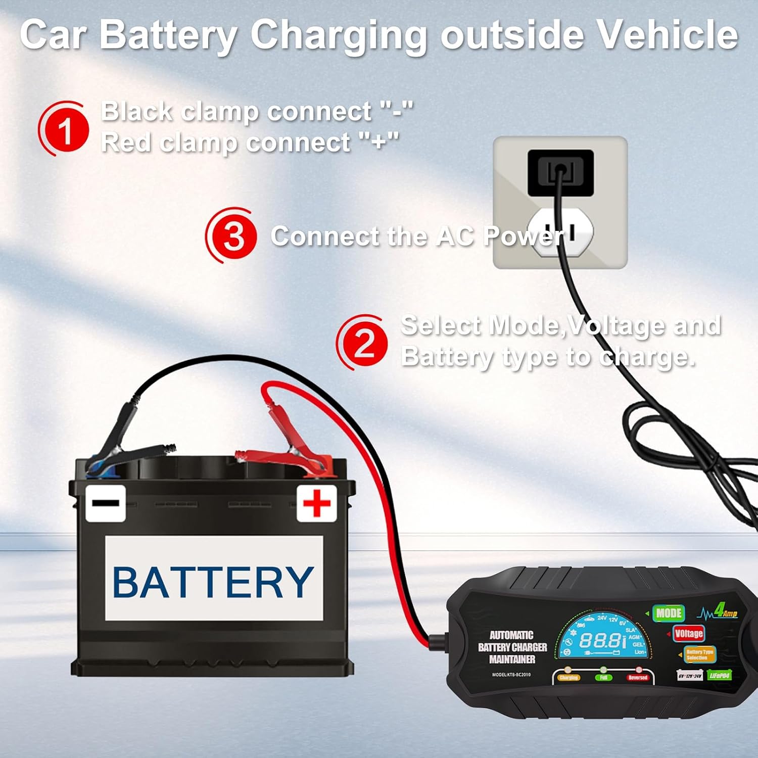 – Carregador de Bateria 12V 4A: Perfeito para carros, caminhonetes e outros veículos maiores, este modelo fornece uma corrente de 4A, permitindo um carregamento mais robusto. A tecnologia inteligente ajusta automaticamente a corrente de saída, garantindo que a bateria receba a quantidade exata de energia necessária.