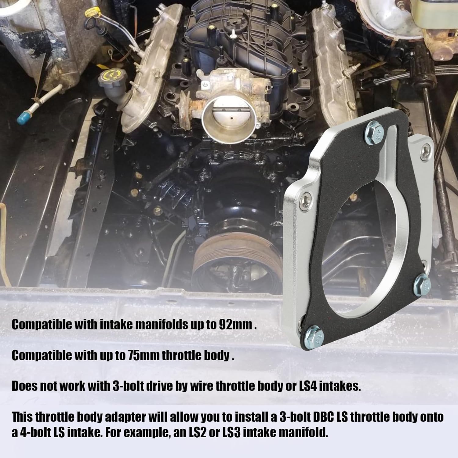 This is a good deal on an LS gen 3, 3 bolt throttle body to a gen 4, 4 bolt throttle body. The gasket seems sufficient. You’ll likely need the 8pin to 6 pin adapter for the wiring harness, which is not included. It’s a pretty simple design, people are even 3d printing them. But when I saw this aluminum version available at a good price, I got this one instead for my project. So far it seems to line up fine, but I can’t test for leaks until I get my wiring harness adapter.