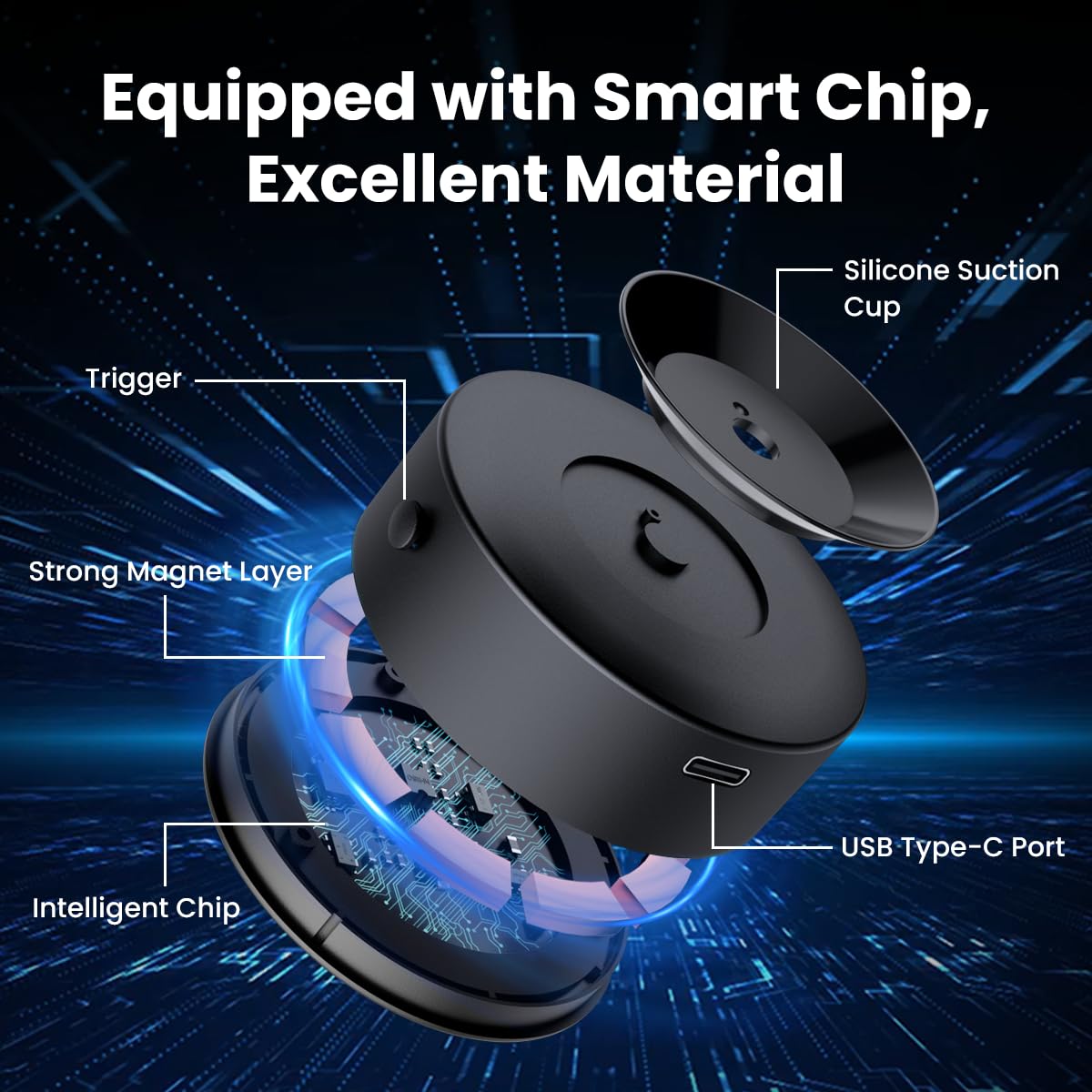 O suporte magnético combina tecnologia de vácuo inteligente com atração magnética, garantindo a estabilidade do suporte, mesmo em estradas acidentadas. A força de adsorção do suporte pode diminuir com a redução da carga elétrica, portanto, é importante mantê-lo carregado.