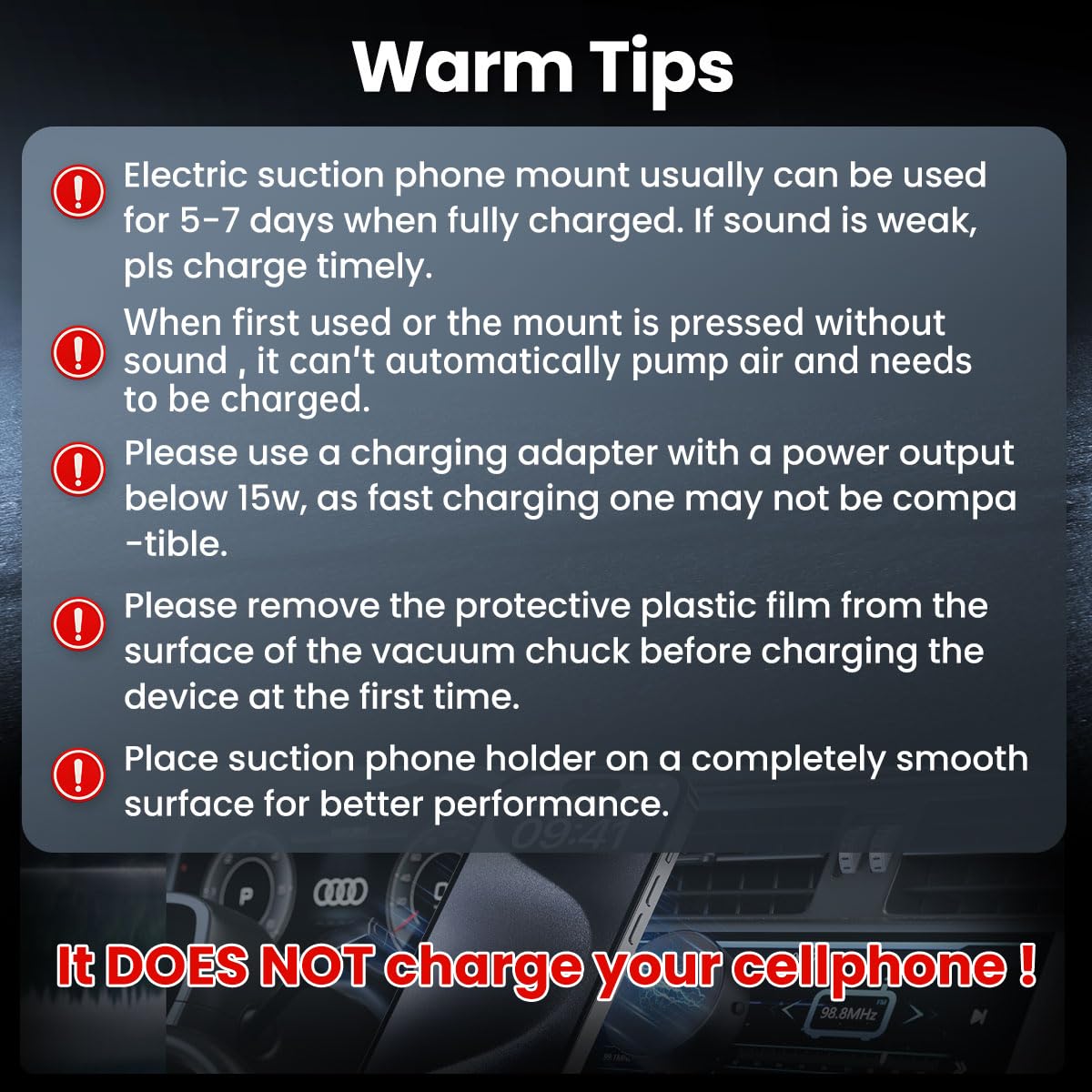 1. O suporte de celular com sucção elétrica pode ser utilizado por 5-7 dias quando totalmente carregado. Se o som estiver fraco, carregue-o imediatamente.
