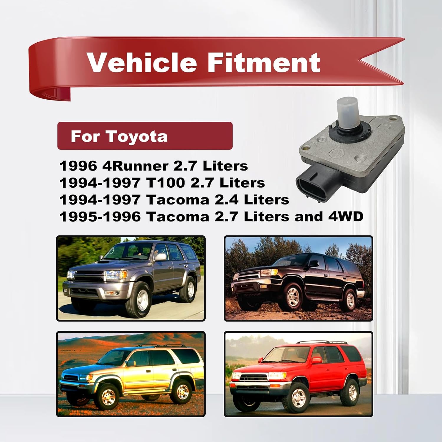 O Sensor de Fluxo de Ar Massivo é compatível com os seguintes modelos: 4Runner 2.7L 1996; T100 2.7L 1994-1997; Tacoma 2.4L 1994-1997; Tacoma 2.7L 1995-1996. Certifique-se de que o modelo correto é escolhido antes da compra para evitar incompatibilidades.