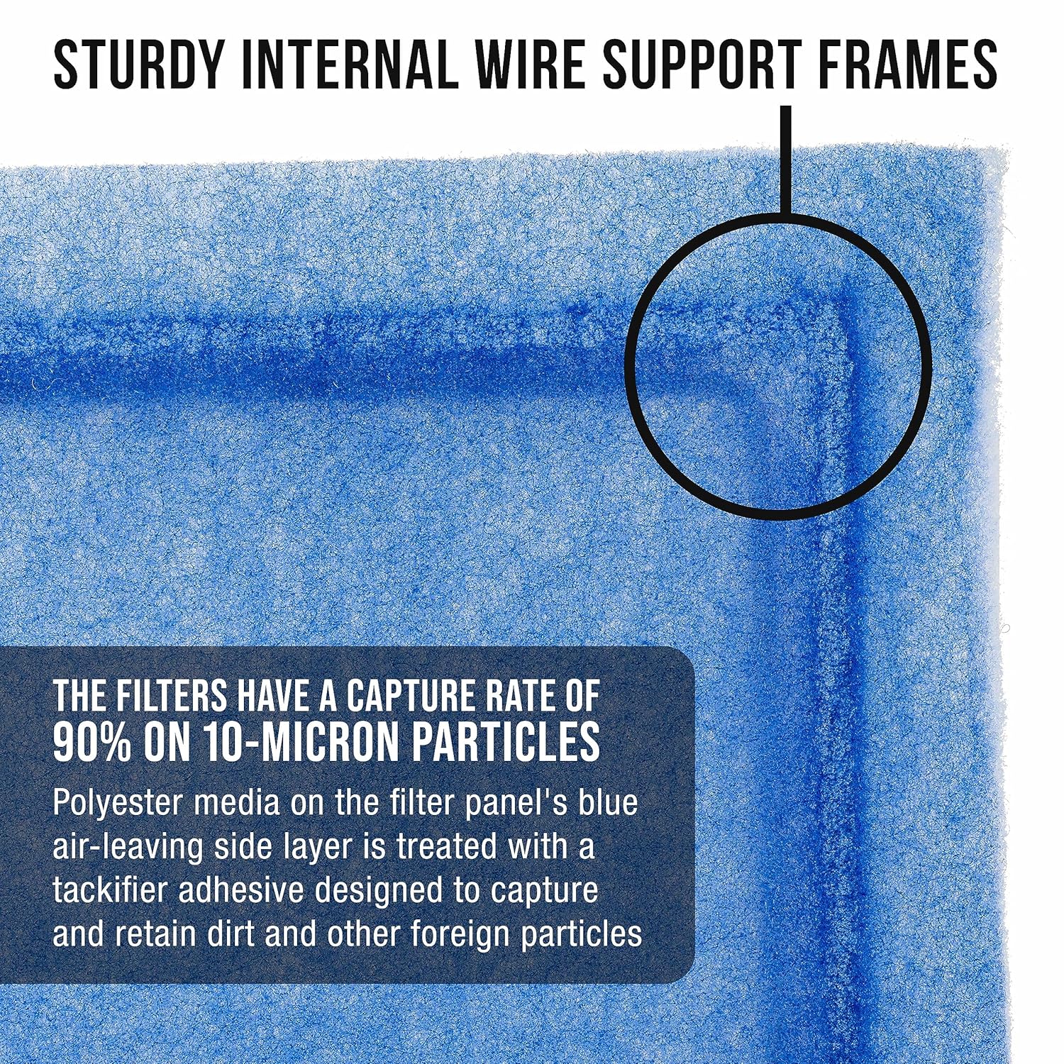 Os painéis de filtro são fáceis de instalar, com um design auto-sustentável que inclui um robusto quadro interno de arame, selado a quente entre duas camadas de mídia de poliéster 100%. Este sistema de vedação auto-adesiva e o quadro interno eliminam o bypass de ar e a flutuação, mantendo as partículas indesejadas fora da cabine de pintura. A camada azul do lado de saída de ar do filtro é tratada com um adesivo tackifier, projetado para capturar e reter sujeira e outras partículas estranhas, alcançando uma taxa de captura impressionante de 90% em partículas de 10 micrômetros.