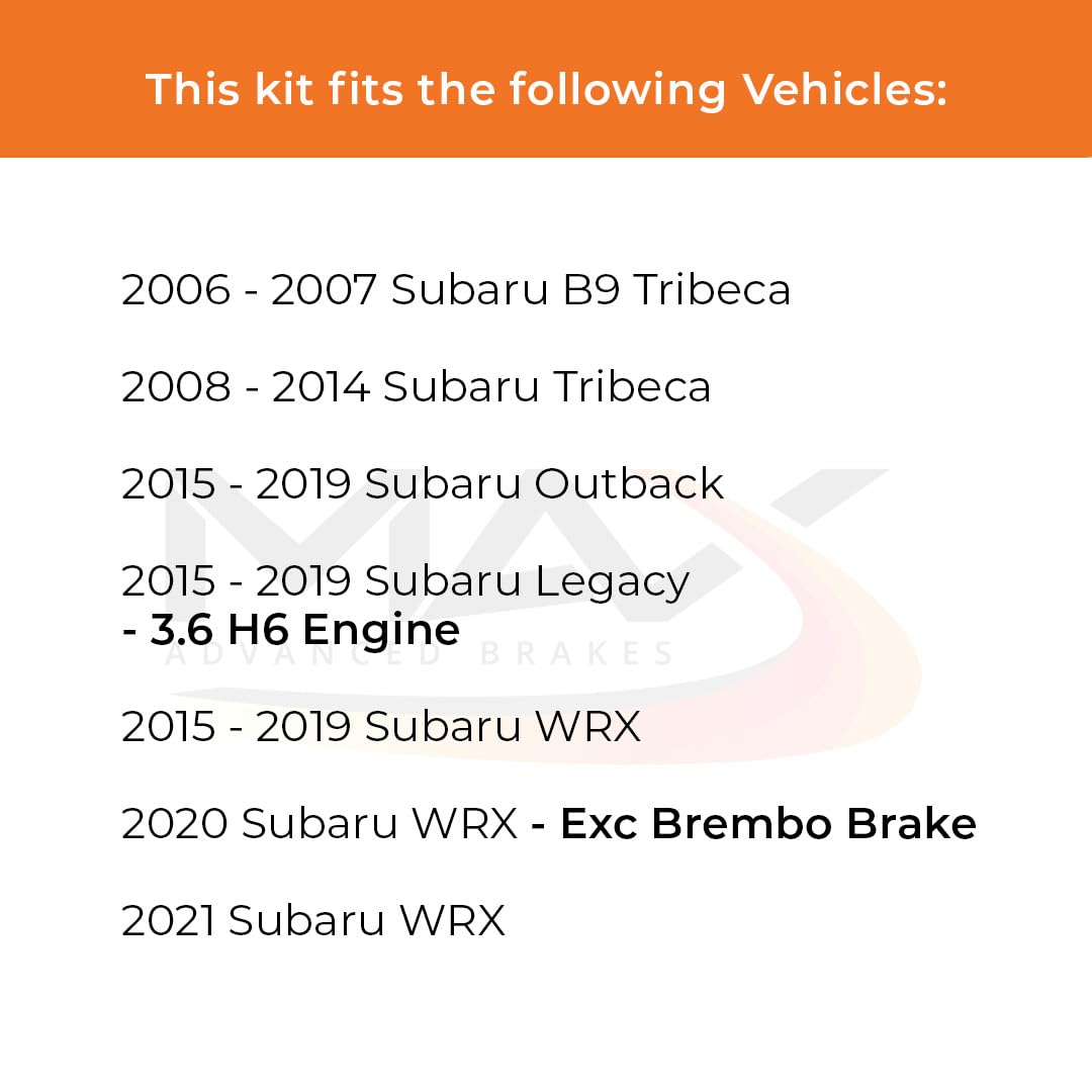 Resposta: O Kit de Freios Dianteiros Max Advanced Brakes é compatível com Subaru B9 Tribeca (2006-2014), Outback (2015-2019), Legacy com motor H6 3.6 (2015-2019) e WRX (2015-2021).