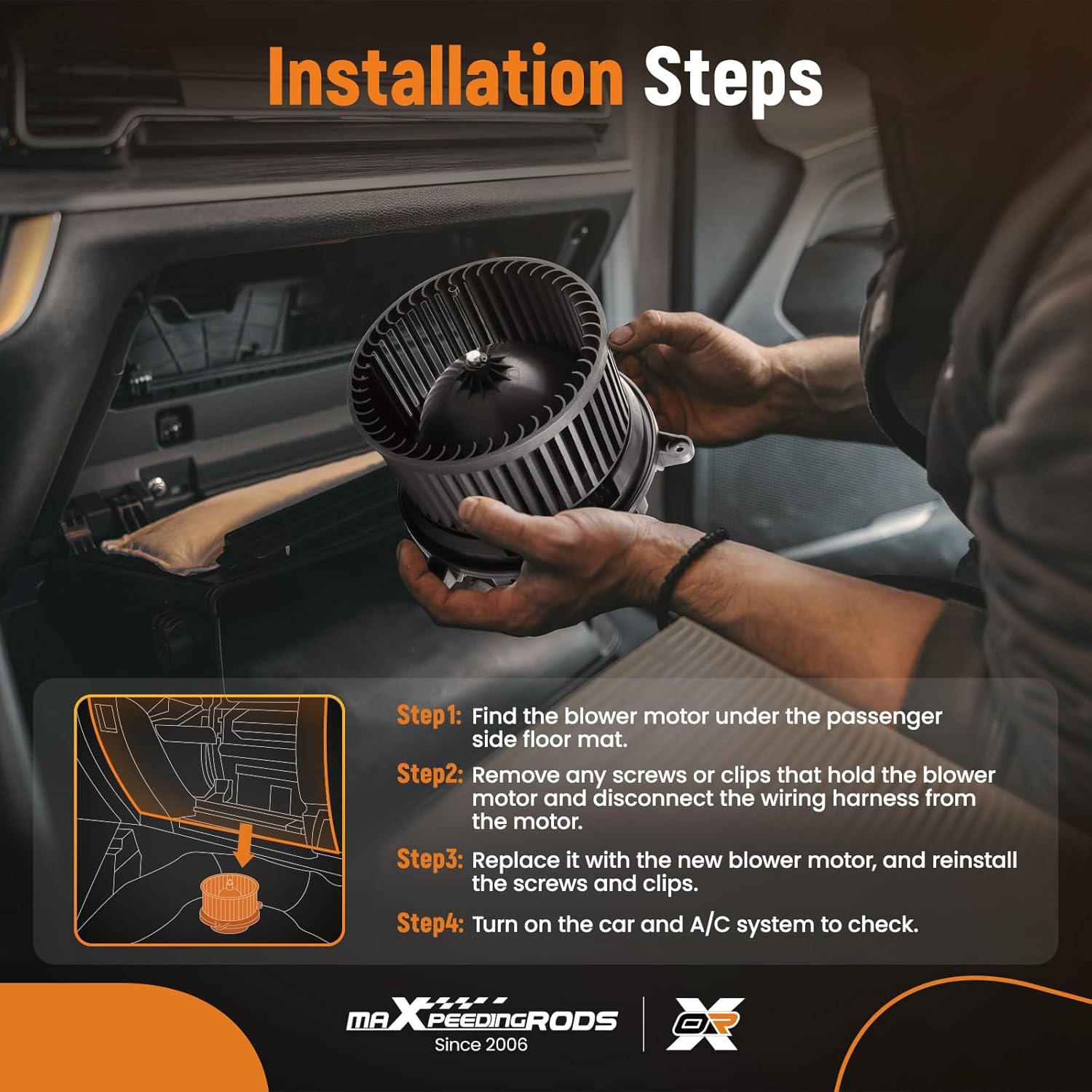 Para instalar o motor do ventilador HVAC maXpeedingrods, comece desconectando a bateria do caminhão para evitar qualquer risco elétrico. Remova o painel de acesso ao motor do ventilador, localizando o componente antigo. Desconecte os fios e retire o motor antigo. Instale o novo motor, conectando os fios corretamente e assegurando que esteja firmemente posicionado. Recoloque o painel de acesso e reconecte a bateria. Teste o funcionamento do ventilador em diferentes velocidades para garantir que tudo esteja operando conforme o esperado.