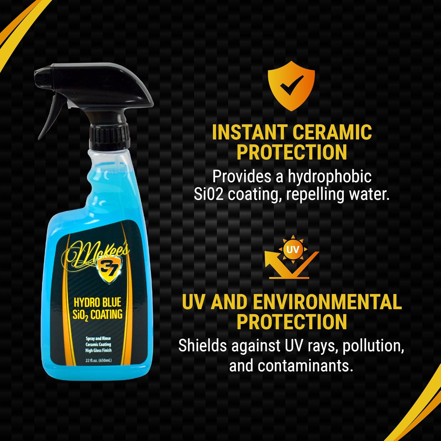 McKee’s 37 Hydro Blue SiO2 Coating is an easy to use, spray on and rinse off nano coating that lasts 3 months or longer. Hydro Blue is 100% safe for ALL exterior surfaces (paint, plastics, glass, wheels, etc).