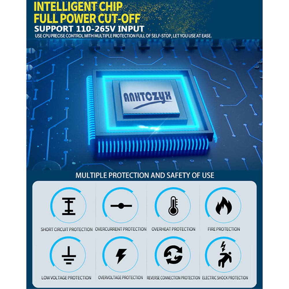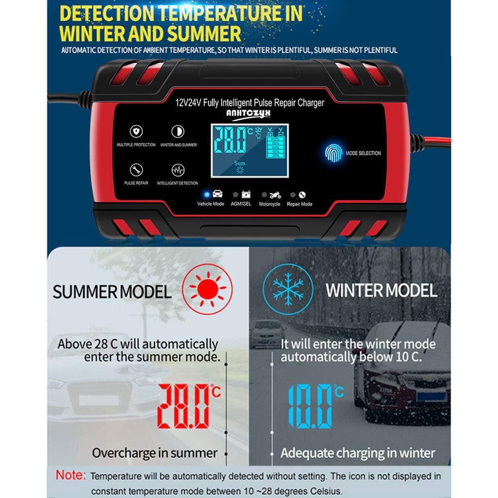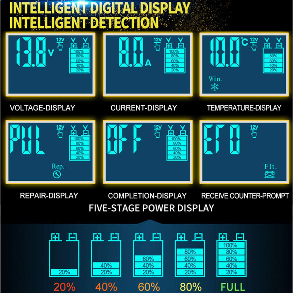 Com proteção de circuito embutida, o carregador previne polaridade reversa, faíscas, sobrecarga, sobrecorrente, circuito aberto, curto-circuito e superaquecimento, oferecendo segurança e confiabilidade durante o uso. O display LCD fornece informações detalhadas sobre o status de carregamento e da bateria, incluindo tensão de carregamento, corrente de carregamento, temperatura interna, status de carga completa, modo de verão e modo de inverno.