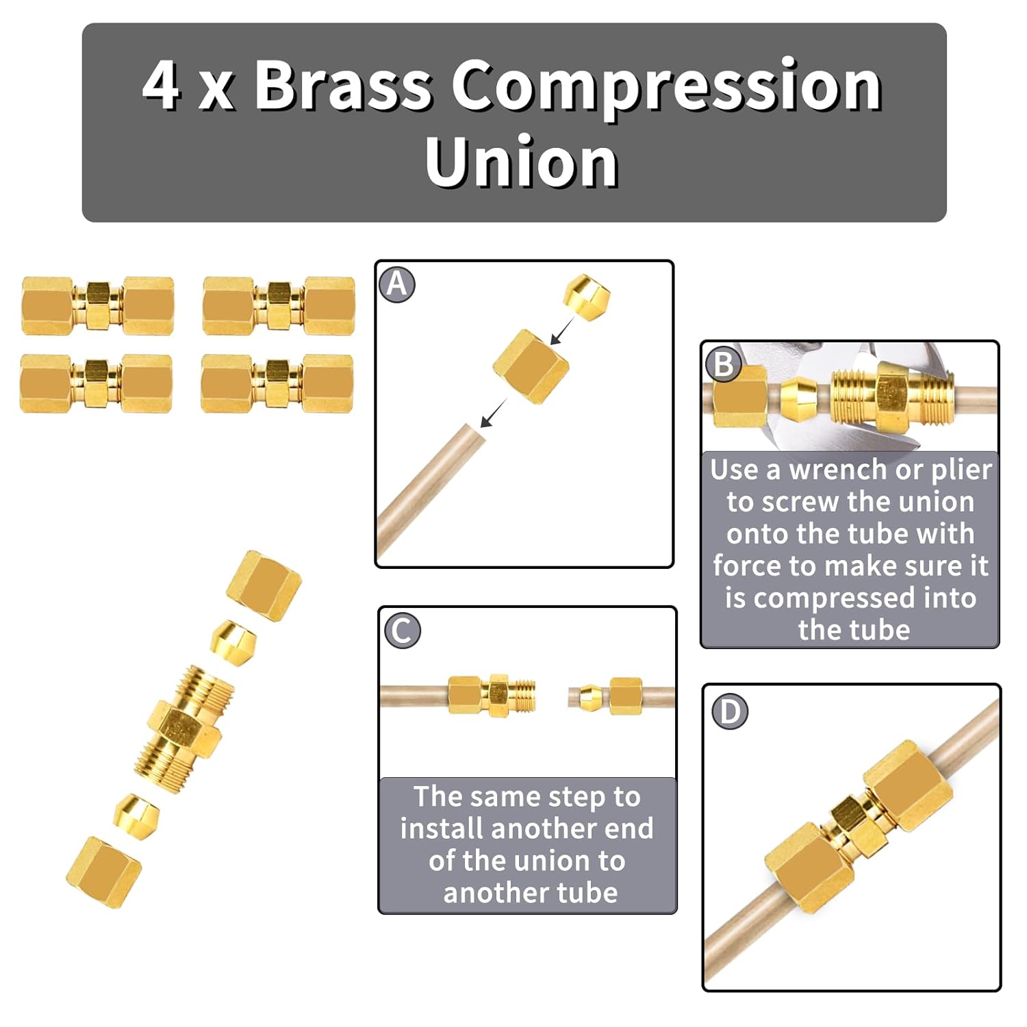 – União de Compressão em Latão: Cada parte da união é fabricada em material de latão durável. Com 2 pequenos anéis de compressão nas uniões, é possível conectar dois tubos não flared, utilizando uma chave para compressão.