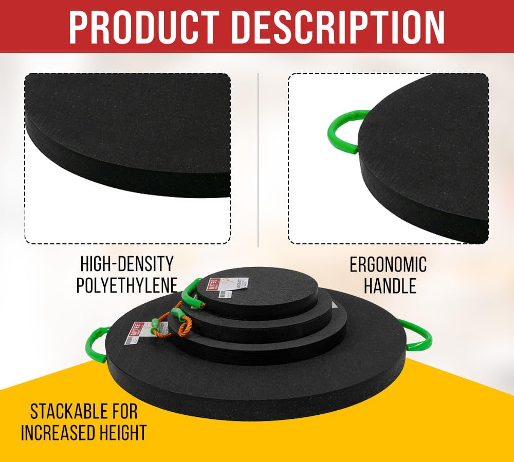 Kit 4 Pads Redondos Mytee 15″ Diâmetro, 1.5″ Espessura, 50.000 lbs WLL - Pads para RV, Leves, Empilháveis, Impermeáveis, Inquebráveis, com Cabo Ergonômico