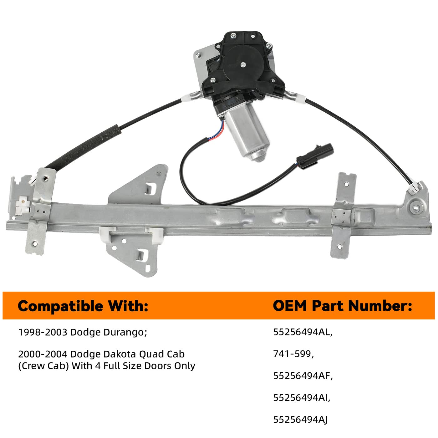 Apresentamos o novo regulador de vidro elétrico traseiro (lado direito) com motor, projetado especificamente para os modelos 1998-2003 Dodge Durango e 2000-2004 Dodge Dakota Quad Cab (Crew Cab) com 4 portas de tamanho completo. Este componente é essencial para garantir o funcionamento adequado da janela traseira do passageiro, proporcionando conforto e conveniência ao usuário.