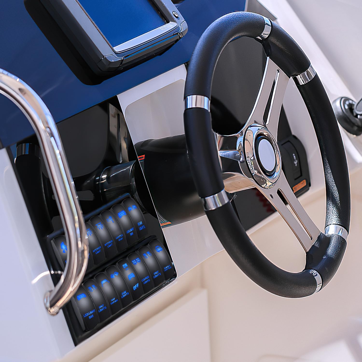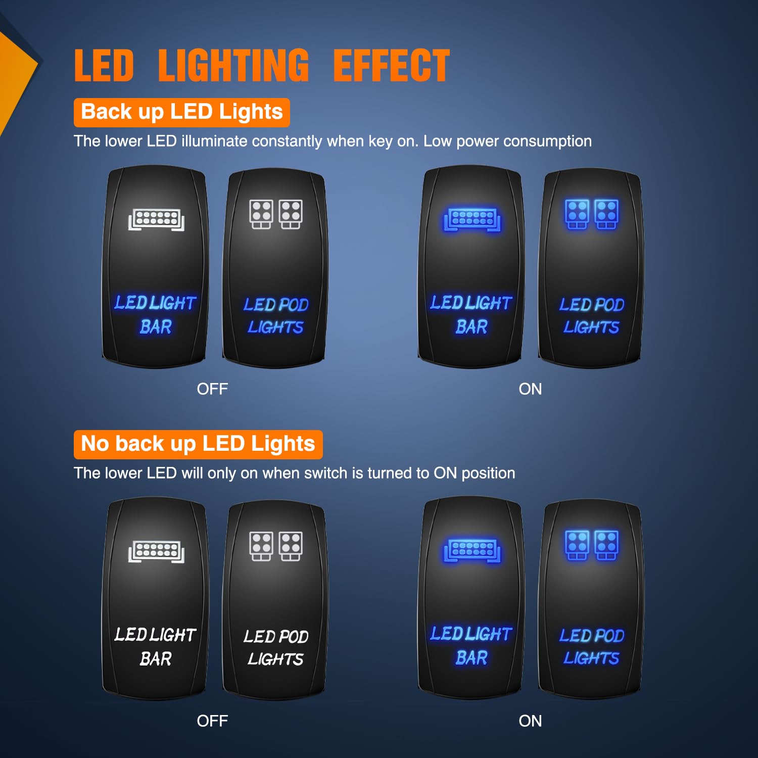 Com uma classificação de 20A/12VDC e 10A/24VDC, este interruptor é amplamente aplicável e pode ser utilizado para atualizar a maioria das fiações existentes. O recurso de iluminação suave, proporcionado por dois LEDs premium embutidos, facilita a localização do interruptor no escuro, garantindo que você nunca fique no escuro ao precisar acionar suas luzes.
