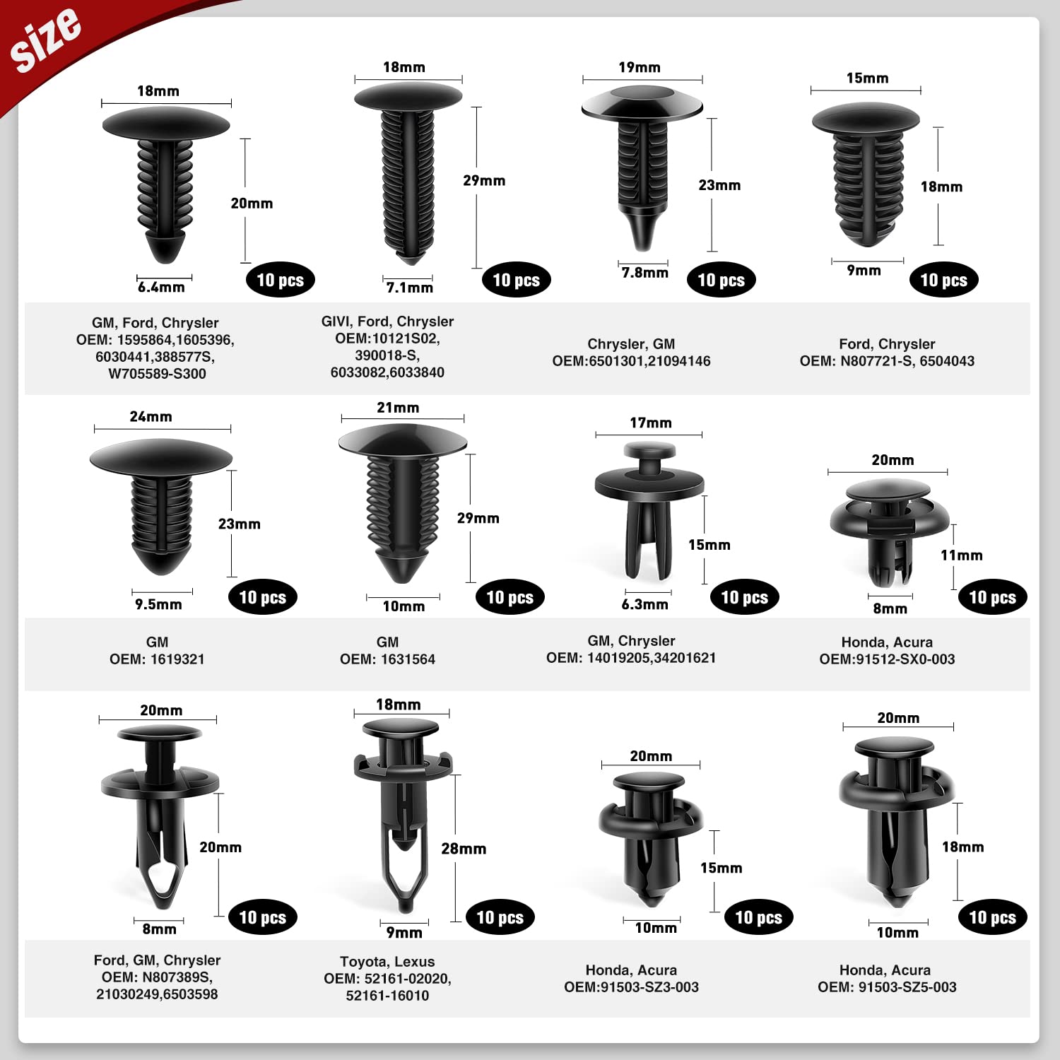 I had a missing piece from my Hyundai bumper/wheel well so I decided to order this kit. I went to find a Hyundai part to realize it didn’t exist… which is fine! Not an issue at all. I ended up trying to use a larger clip than the others which worked. Screw you pothole haven! All jokes aside, the clips felt good quality. Only oneeeee issue. Upon opening the box, the clip to the box decided to break. I’m kinda bothered by that and tempted to return it. The top shattered as well. So the plastic is.. extremely cheap. But again. Not a big problem. The clips did their job, (so far).