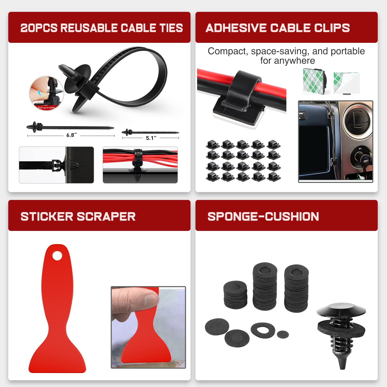 - Conteúdo da Embalagem: O conjunto inclui 120 peças de clipes de retenção em 12 tamanhos, 30 esponjas de proteção, 10 laços de cabo reutilizáveis, 20 clipes adesivos para cabos e 58 ferramentas de remoção de acabamento, tudo organizado em uma bolsa portátil.