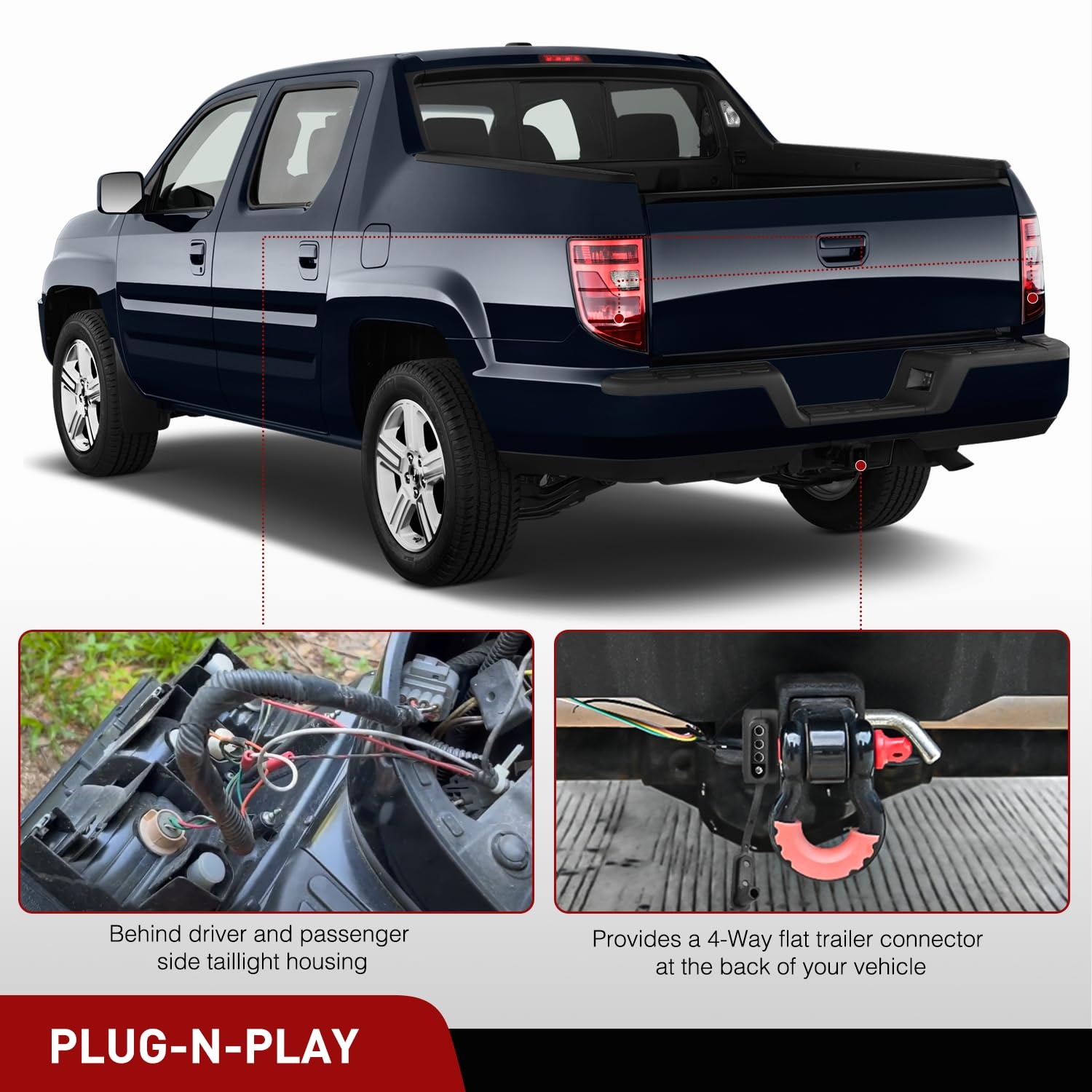 O Nilight 4 Pin Trailer Wiring Harness Kit 55585 é a solução ideal para quem possui uma Honda Ridgeline de 2006 a 2014 e busca uma conexão de reboque eficiente e prática. Este kit de fiação para reboque é projetado especificamente para se integrar perfeitamente ao sistema elétrico do seu veículo, utilizando conectores compatíveis com OEM que se conectam diretamente à fiação original, localizada atrás da carcaça das luzes traseiras do lado do motorista e do passageiro.