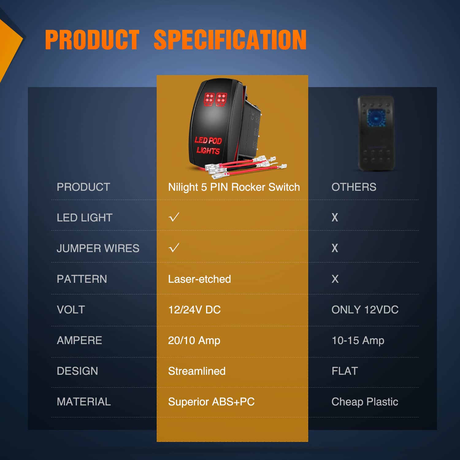 Além de sua funcionalidade, o Nilight Rocker Switch é robusto e durável. Fabricado com plástico de alta qualidade e pinos bem condutores, ele é projetado para resistir ao desgaste do uso diário. O padrão laser-etching garante que as marcações não desbotem com o tempo, mantendo a estética e a legibilidade do interruptor.