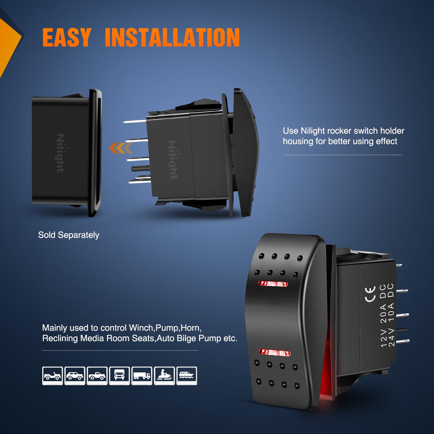 Construído com plástico de alta qualidade e pinos bem condutores, o Nilight é projetado para oferecer durabilidade a longo prazo. Sua construção robusta é otimizada para uso geral, proporcionando uma experiência agradável e sem preocupações. Além disso, o interruptor conta com múltiplas proteções de segurança, incluindo proteção de circuito de saída, proteção contra sobrecarga e proteção contra polaridade reversa. Equipado com dois LEDs premium, o interruptor oferece visibilidade clara à noite, tornando-o mais seguro e conveniente de usar.