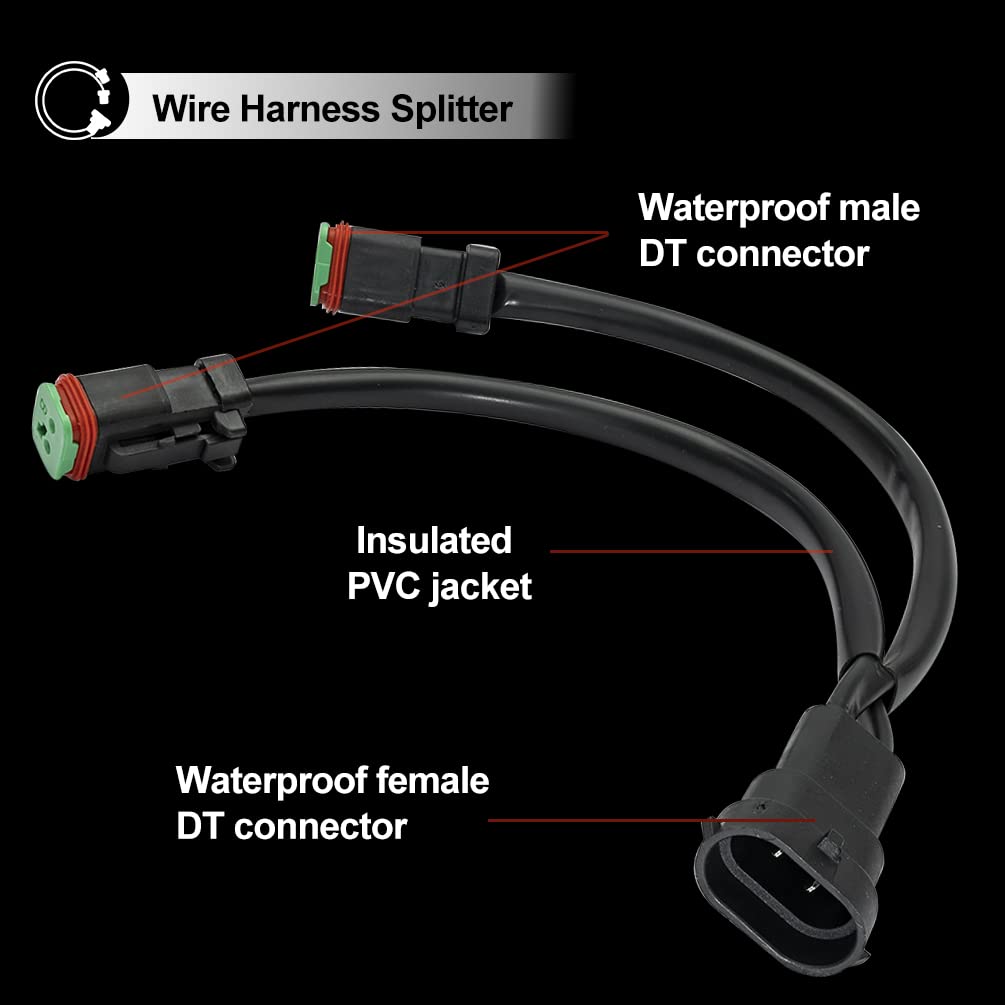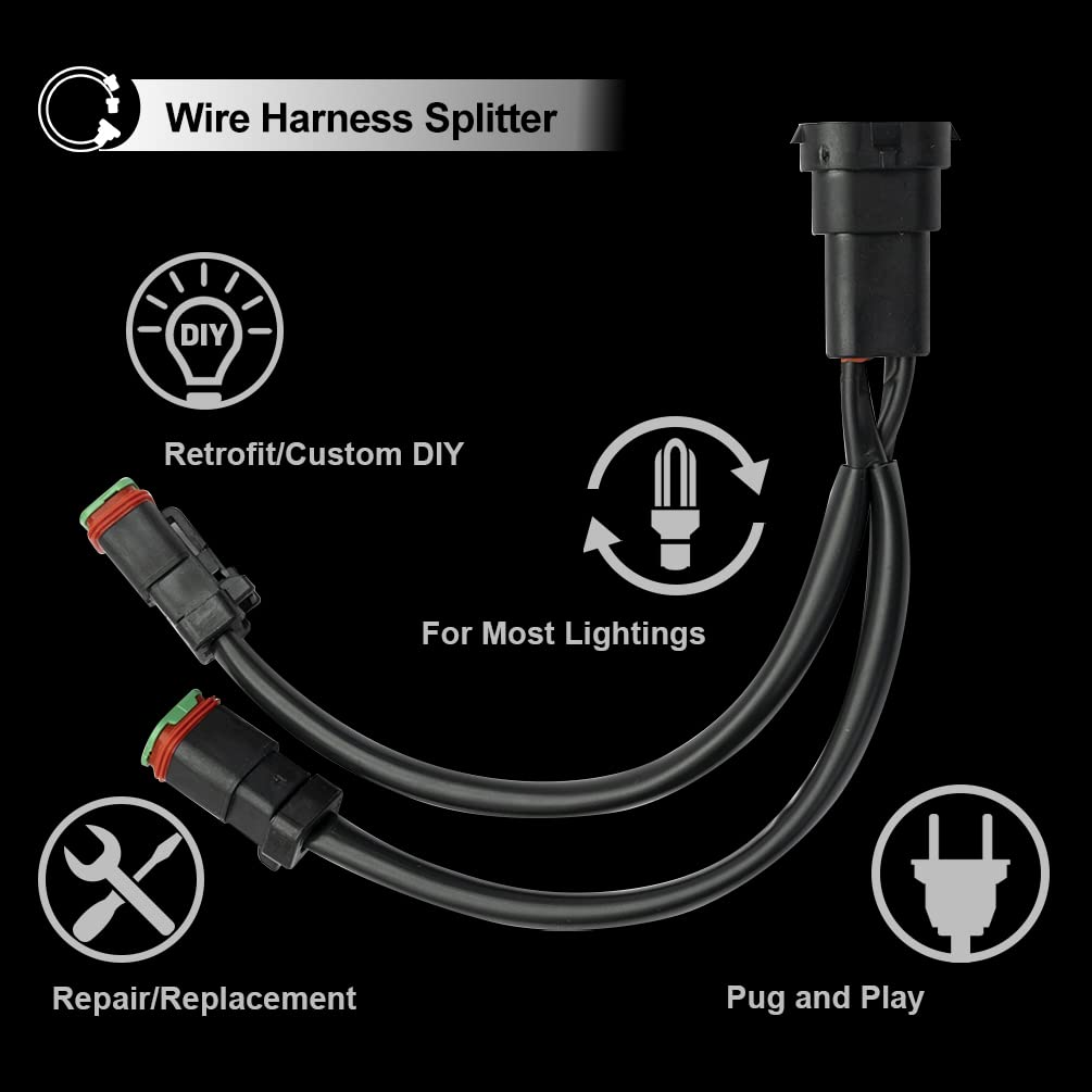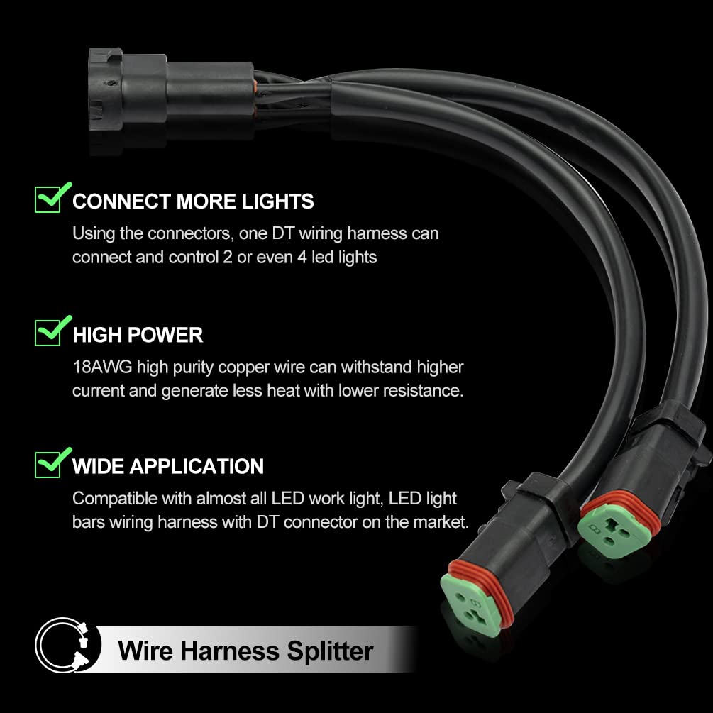 O adaptador apresenta um formato em Y, com uma entrada masculina e duas saídas femininas, permitindo que você conecte múltiplas luzes LED simultaneamente. Essa configuração é perfeita para quem deseja atualizar as barras de LED, lustres LED, faróis de neblina e outros produtos de iluminação off-road que utilizam conectores DTP disponíveis no mercado. A instalação é descomplicada, pois o sistema é plug and play, eliminando a necessidade de fiação adicional entre a barra de LED e o kit de fiação.