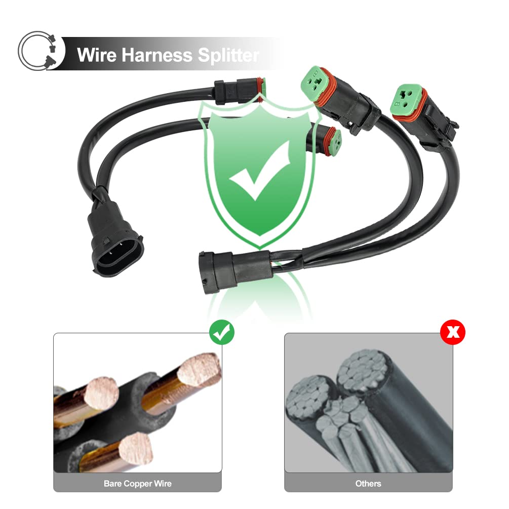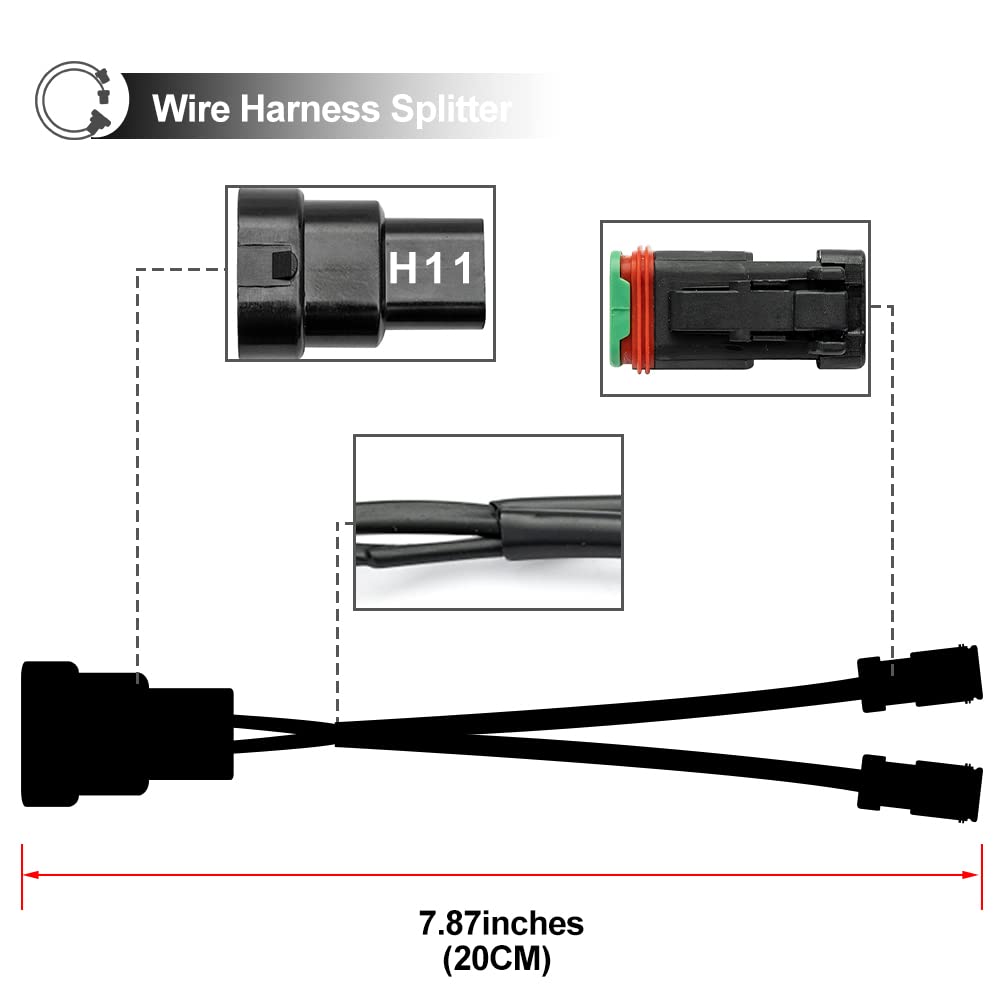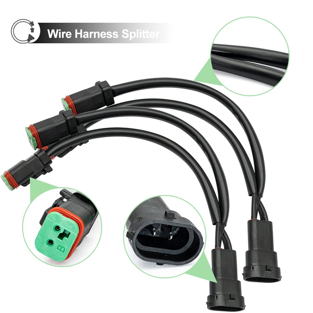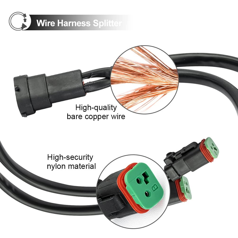 O adaptador apresenta um formato em Y, com uma entrada masculina e duas saídas femininas, permitindo que você conecte múltiplas luzes LED simultaneamente. Essa configuração é perfeita para quem deseja atualizar as barras de LED, lustres LED, faróis de neblina e outros produtos de iluminação off-road que utilizam conectores DTP disponíveis no mercado. A instalação é descomplicada, pois o sistema é plug and play, eliminando a necessidade de fiação adicional entre a barra de LED e o kit de fiação.