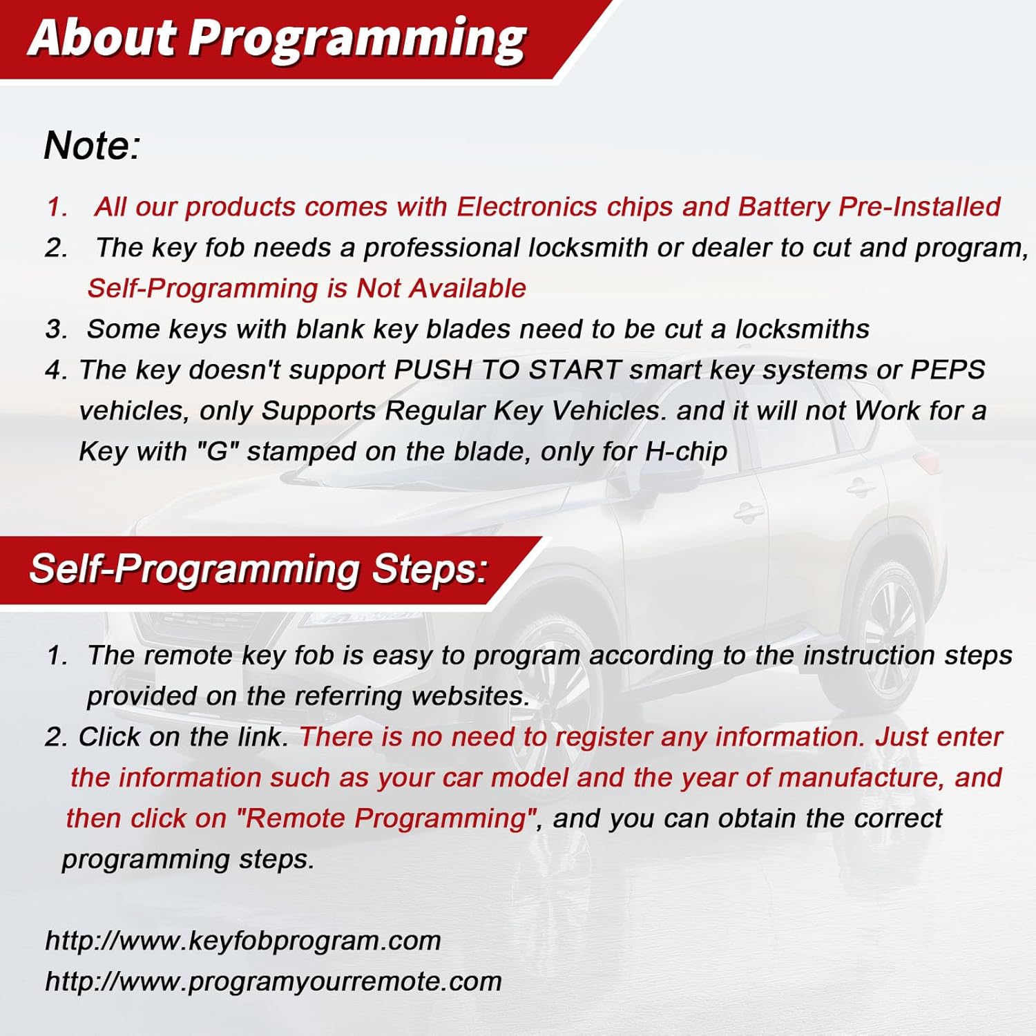 - Programação: É necessário que o NPAUTO Key Fob seja programado e cortado por um profissional, como um revendedor ou chaveiro. Nota: Este controle não é compatível com sistemas de chave inteligente “PUSH TO START” ou veículos PEPS, funcionando apenas com veículos que utilizam chaves regulares. Não funcionará com chaves que tenham “G” estampado na lâmina, apenas com chaves H-chip.
